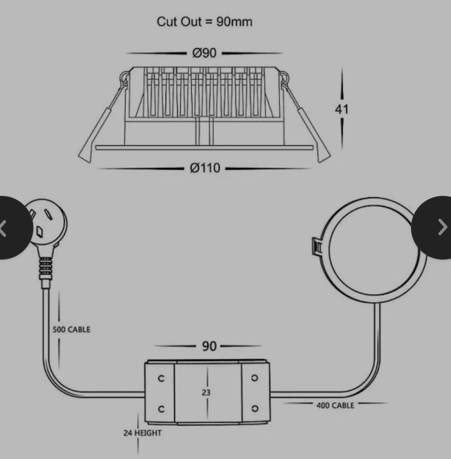 This downlight is 90mm cut out which is about 80% of downlights most homes will have. The face has an extra 20mm lip so it can suit up to around 105mm cutout. The cable from the downlight to the plug is 1 meter for easy installation in the ceiling. We recommend installing with a plug base rather than hardwire, this will allow you to replace or change at a later date without an electrician.