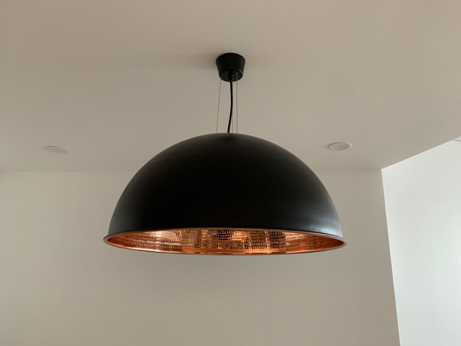 The Alfresco Lamp is a new take on our tremendously popular egg lamps, now designed specifically for living room's, offices and bedrooms. This fixture features a unique beaten metal texture with a stunning matte black exterior and a polished copper interior. This light is certain to bring a sense of undeniable modern interior style to your room.