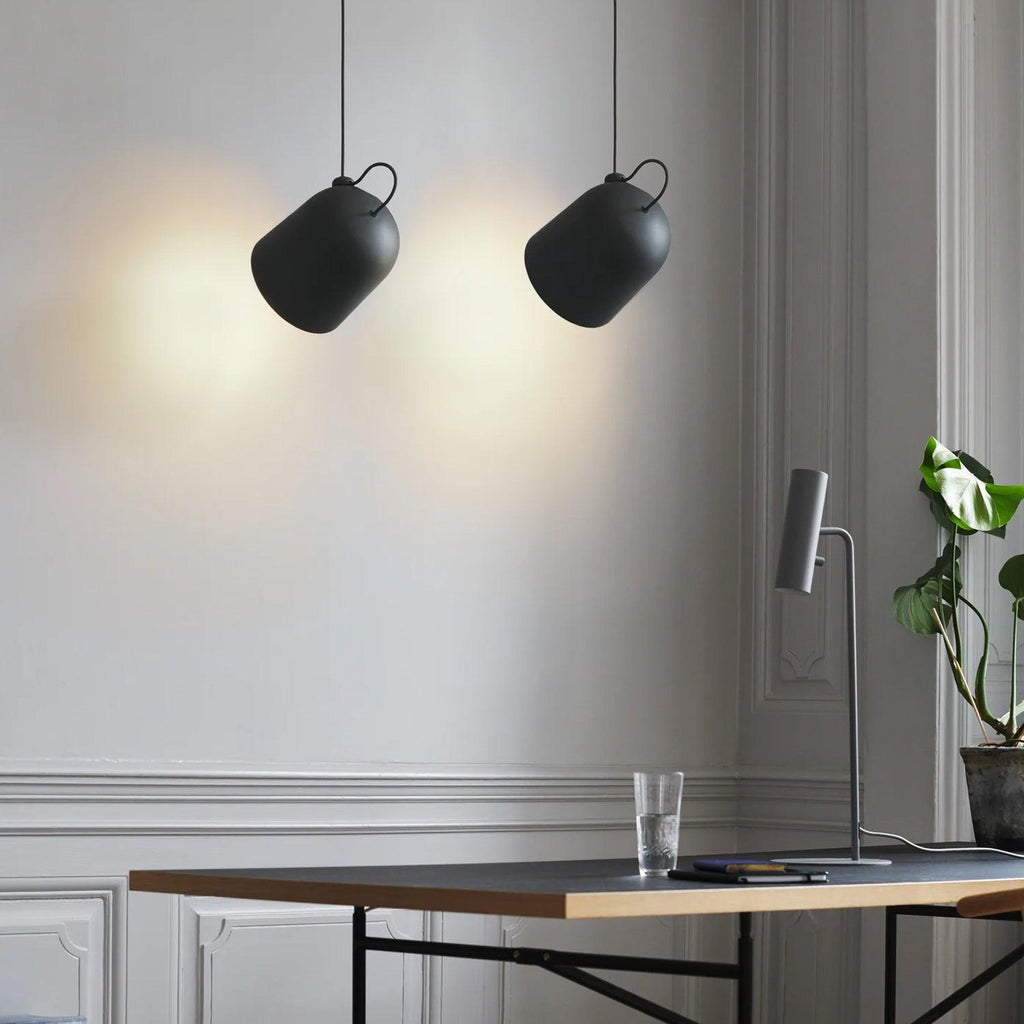 Contemporary, industrial style pendant design featuring a magnetic component that allows the user to adjust and angle the shade in any direction. Also includes an opal plastic diffuser for even light distribution. Available in Black, White and Grey.