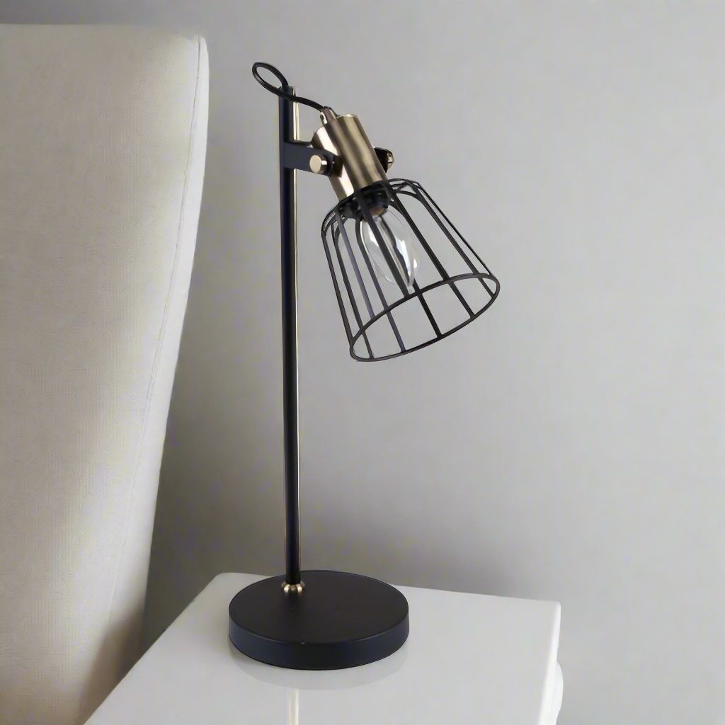 ASHLEY-DL desk lamp Series combines a metal base, thin frame and wire guard shade, which offers a slim and linear appearance for most modern interior decors. Ideal as a feature lamp in living rooms and bedrooms. Featuring plated Matt Black with Antique Brass highlights. Part of a family of matching floor lamp, table lamps, as well as hanging pendants.