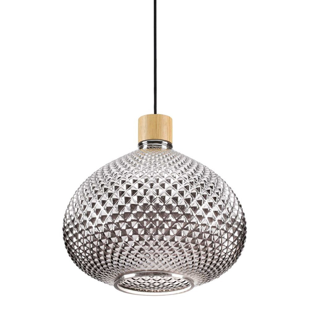 Black powder coated metal ceiling cup. Natural wood frame. Clear blown glass diffuser with motif in relief and smoky finish. Power cable coated with fabric.