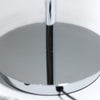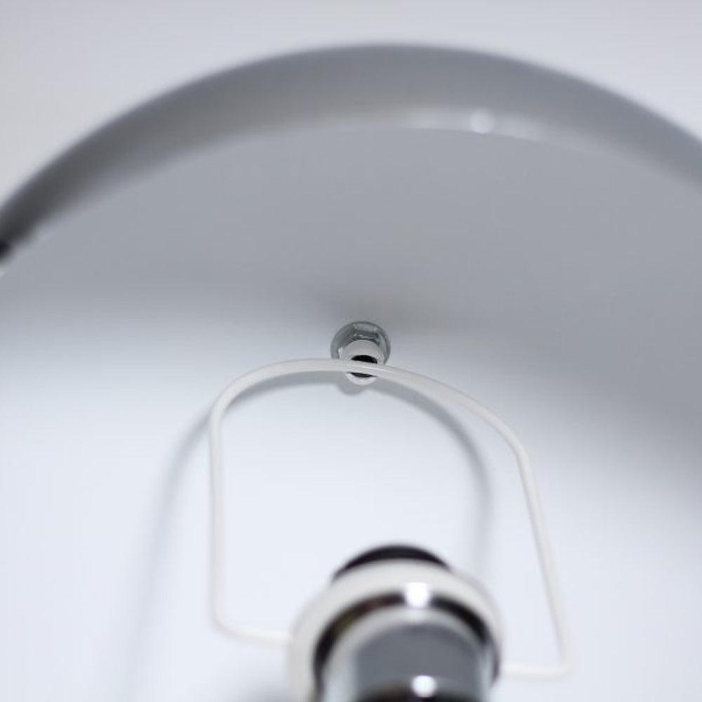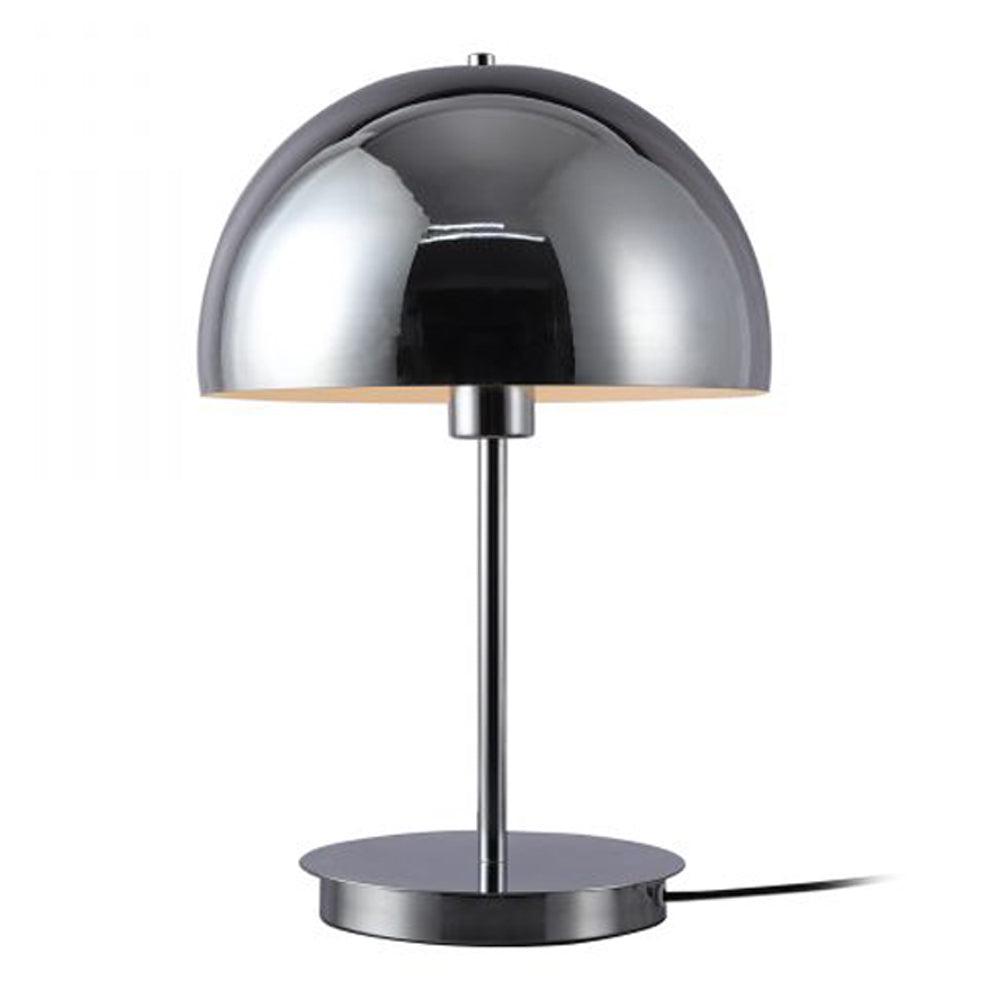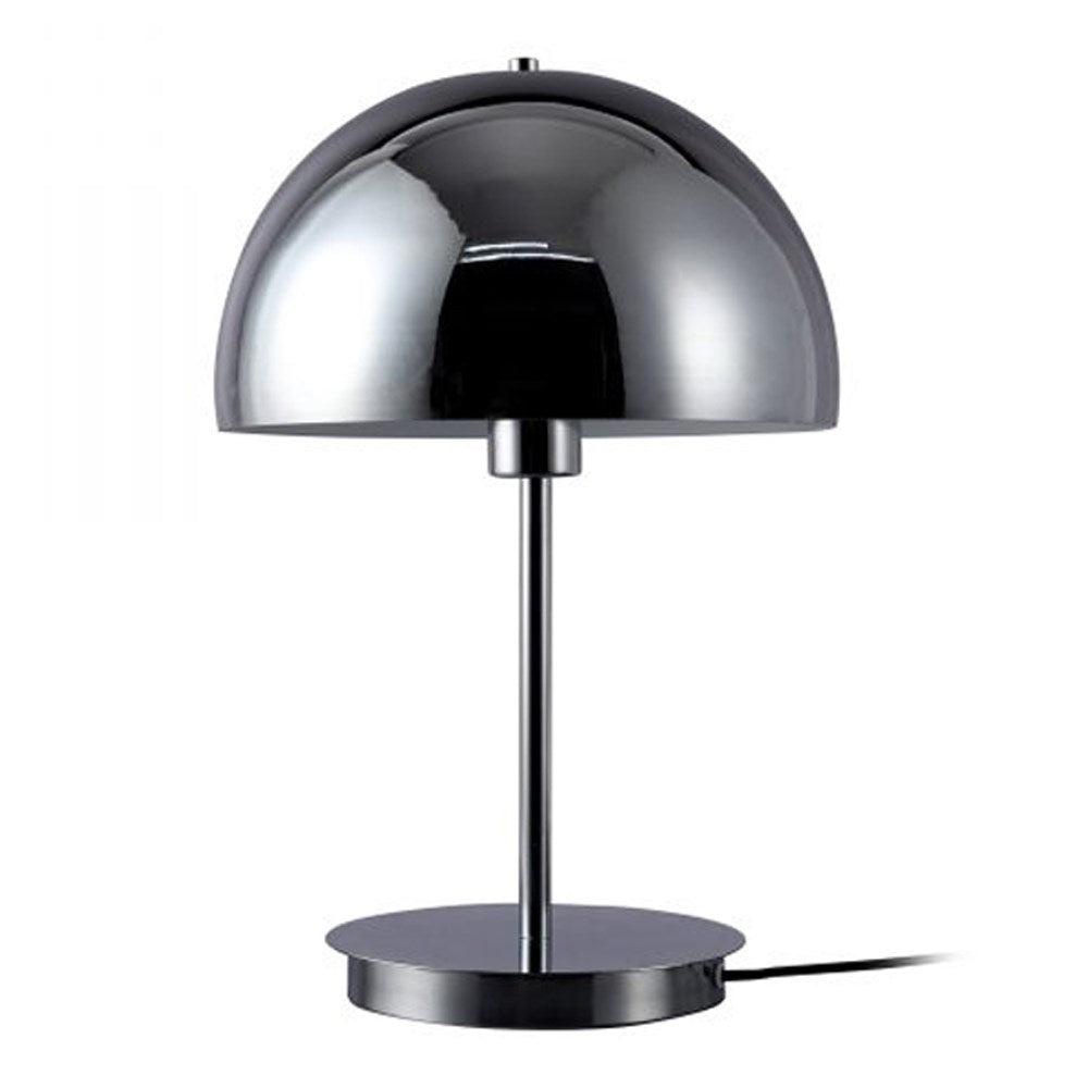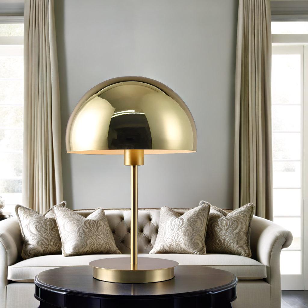 The Brenda Table Lamp features a modernistic polished metal finish on a prominent semi-dome design. The half-dome lamp shade faces up as if the light is projecting it towards the ceiling like a metallic comet. Below the semi-dome, a minimalist metal support column suspends the main orbicular feature from a plate and slimline cylindrical base; the simple shape highlights the pronounced semi-orb above.