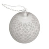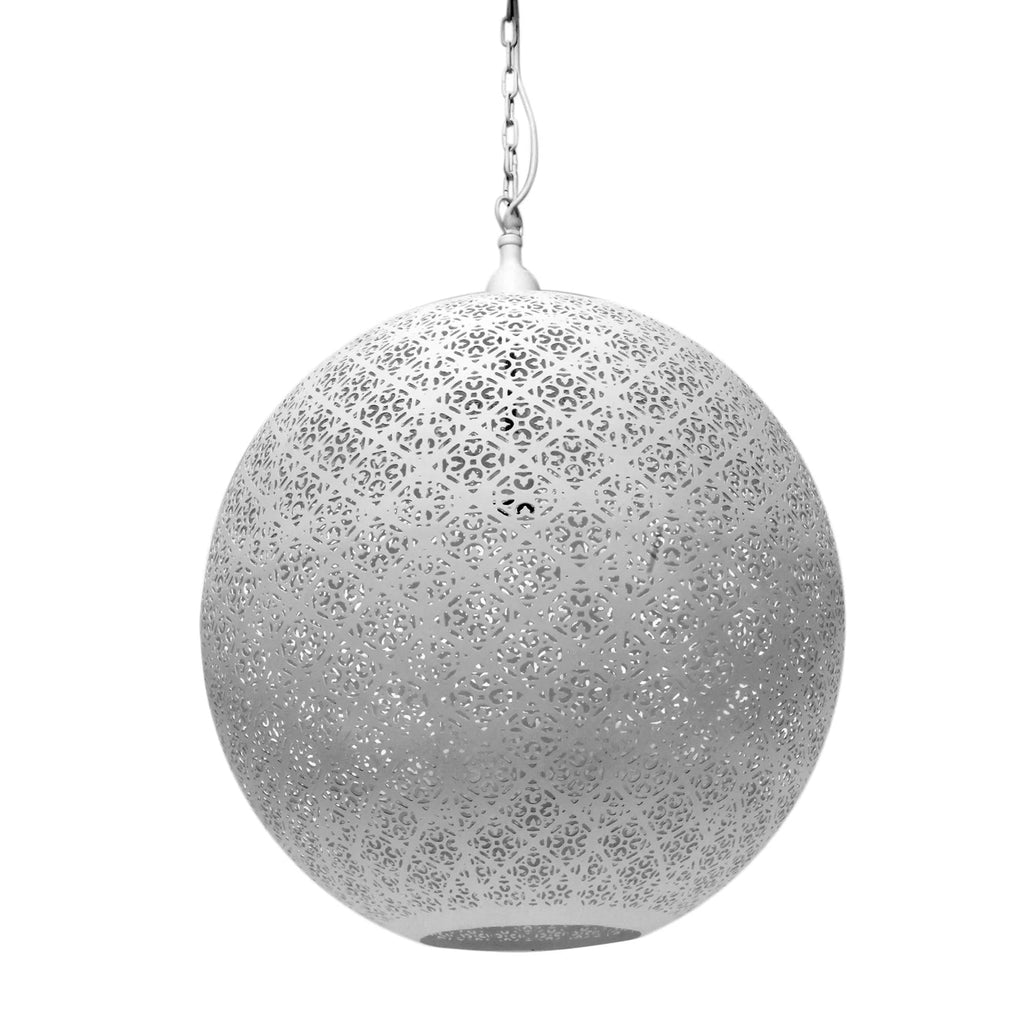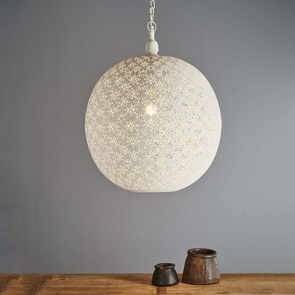 A large round pendant featuring a delicately-patterned, perforated matt white outer shell. When unlit the exterior shows the delicate perforations, when illuminated the light radiates out through the perforations.