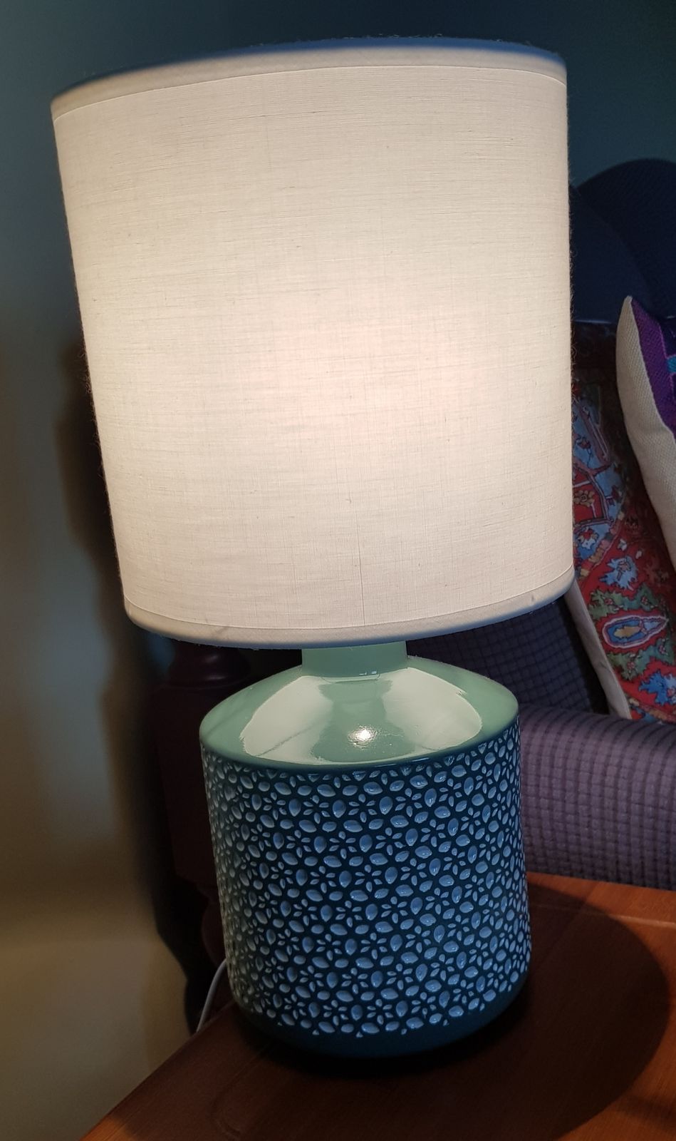 CELIA ceramic table lamp complete with fabric shade. The Celia base has an embossed geometric pattern and is supplied with an off-white poly-cotton laminated shade. Pretty little bedside, available in glossy retro colours! Switch is conveniently on the cord.