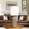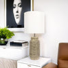 A tall, beige, base with inscribed, brown-black cross-hatching, a long brushed-chrome neck and an ivory linen drum shade make up the ZAMORA ceramic table lamp. Very retro.