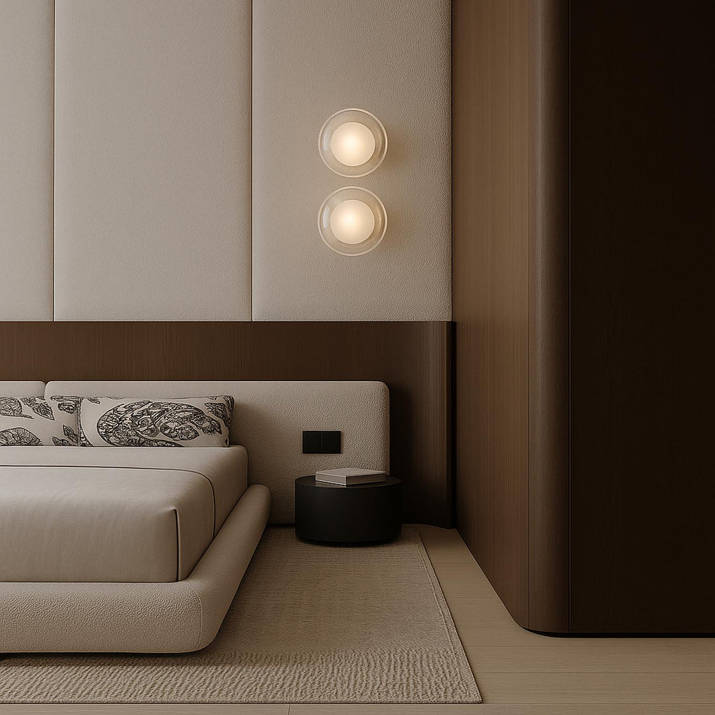 With its pairing of opal glass and a crisp white base, the Cielo Orb Wall Light casts a soft, diffused glow that adds quiet refinement to any space, available in two sizes (Ø130mm and Ø160mm) and crafted from aluminium and glass for a minimalist presence ideal in bathrooms, hallways, or beside the bed.