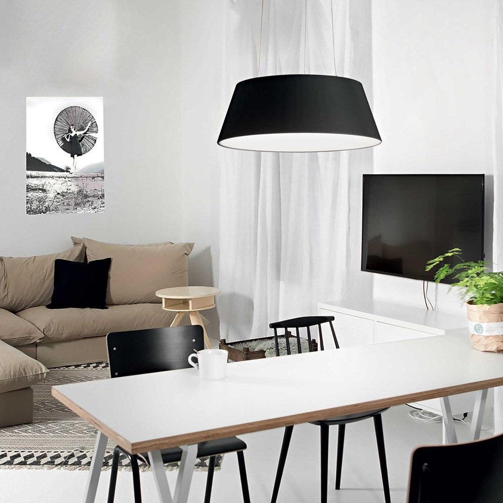 Canopy and lampshade in powder-coated or plated metal. Opal polycarbonate diffuser. Transparent pvc cable..