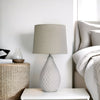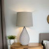 The Danu white textured ceramic table lamp comes complete with a tapered fabric drum shade. This sleek lamp is perfect for a bedside or study nook in a modern or hamptons styled home. The on/off switch is located on the cord.