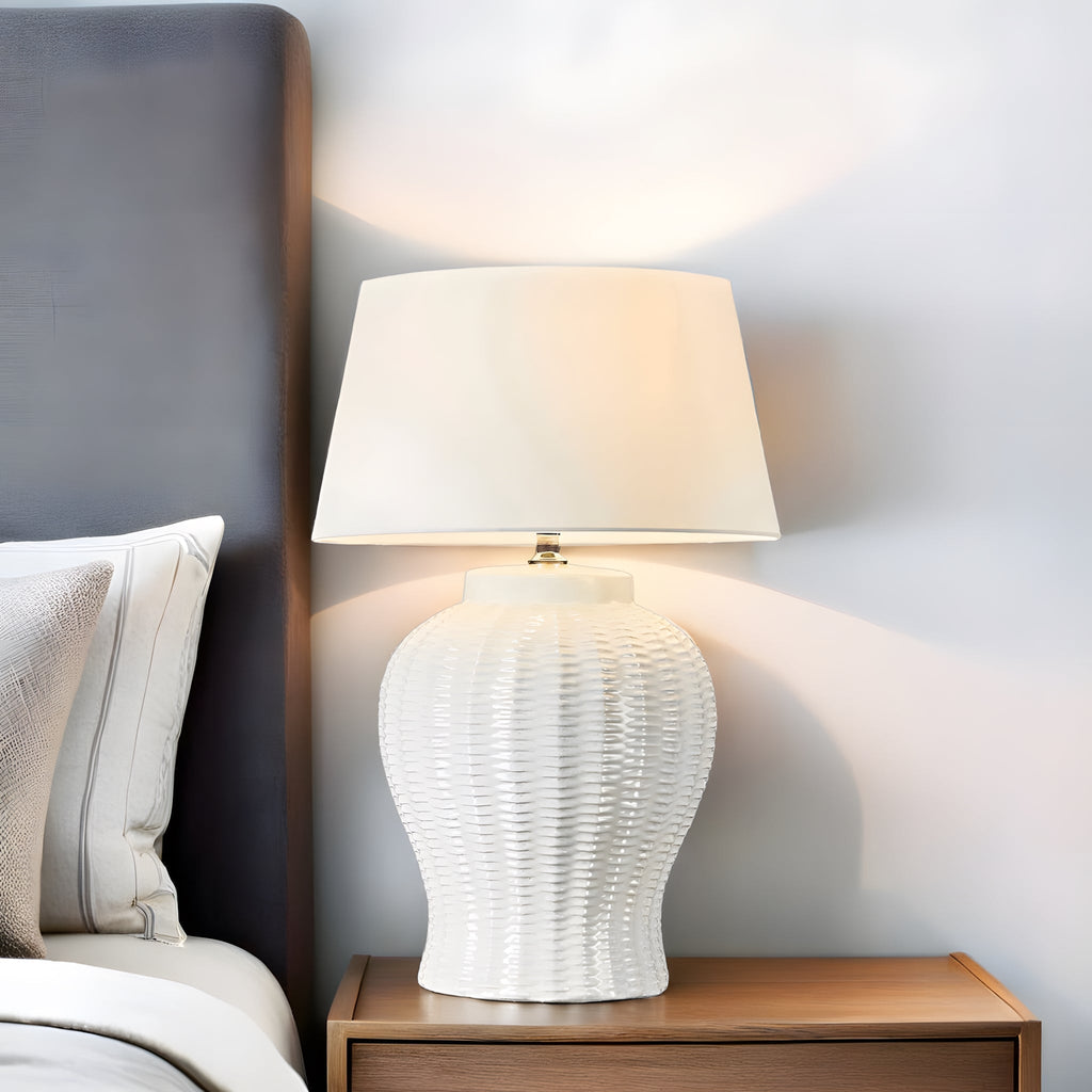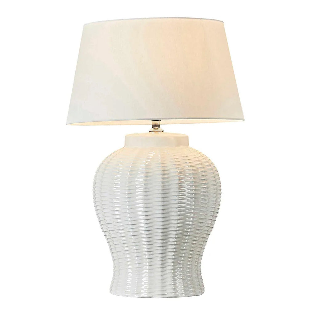 The Drawbridge is a sophisticated table lamp crafted in ceramic with an ivory white glaze. Featuring a basket design pattern, the Drawbridge is sure to bring an elegant and polished feel to your space.