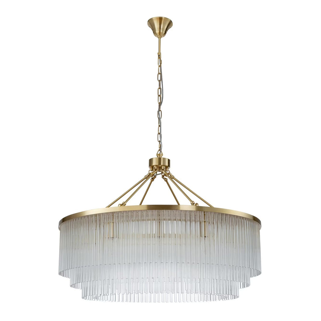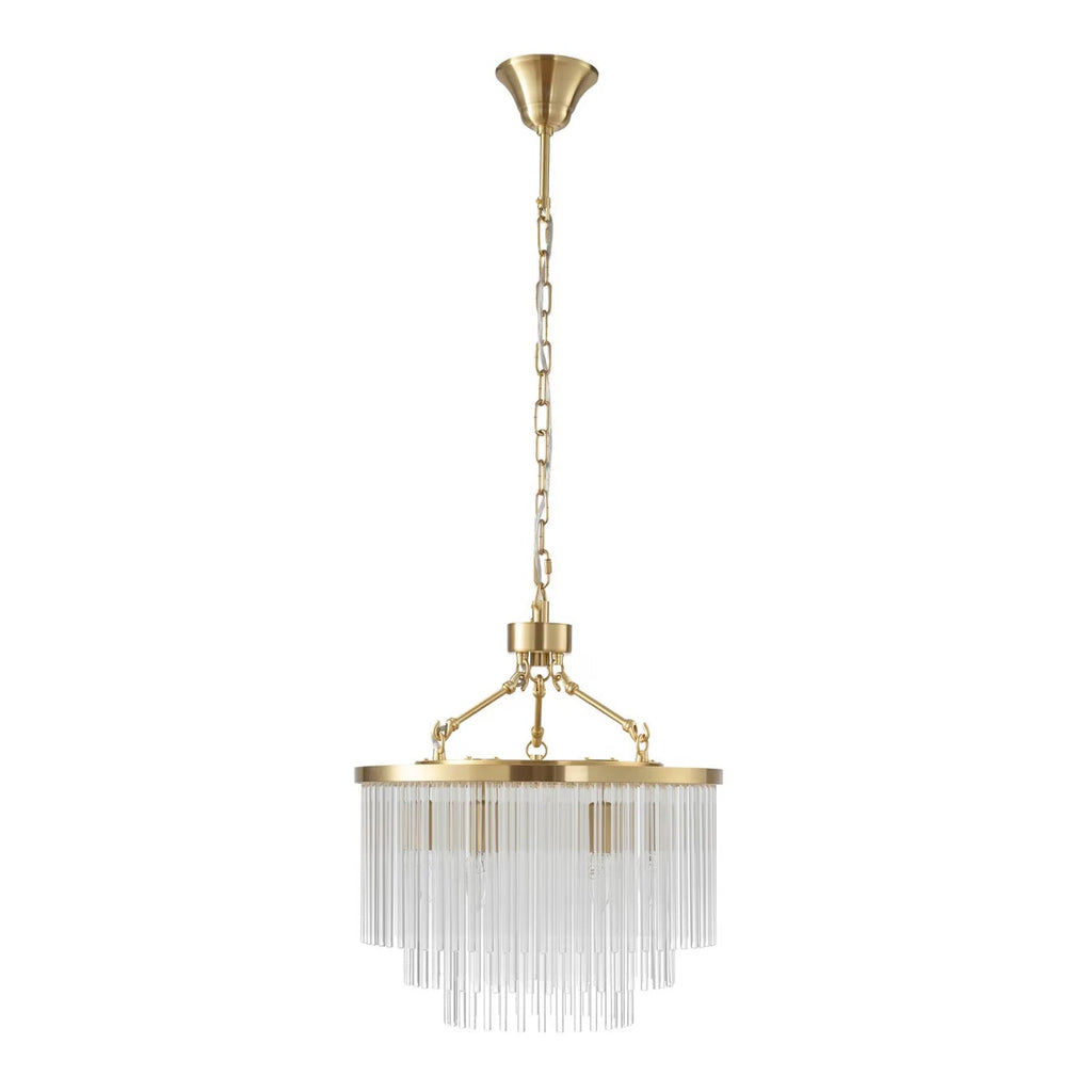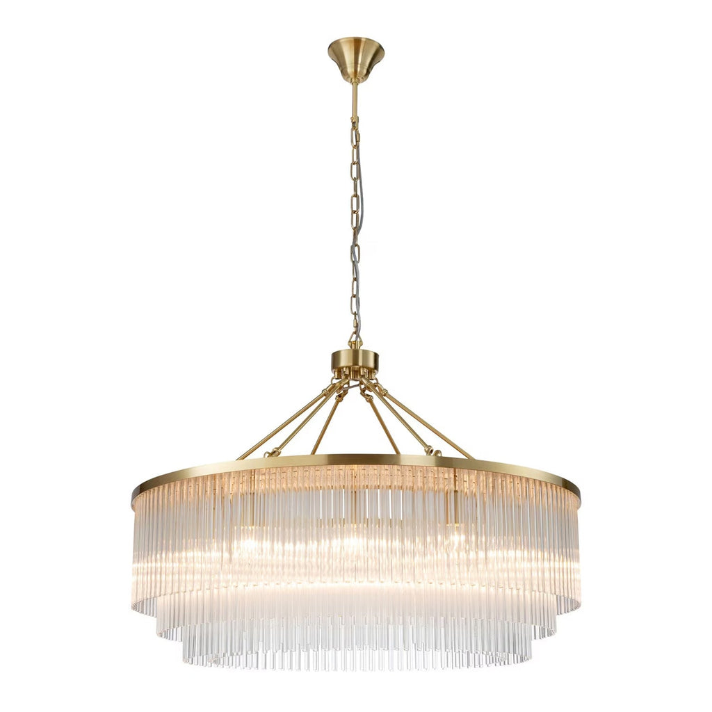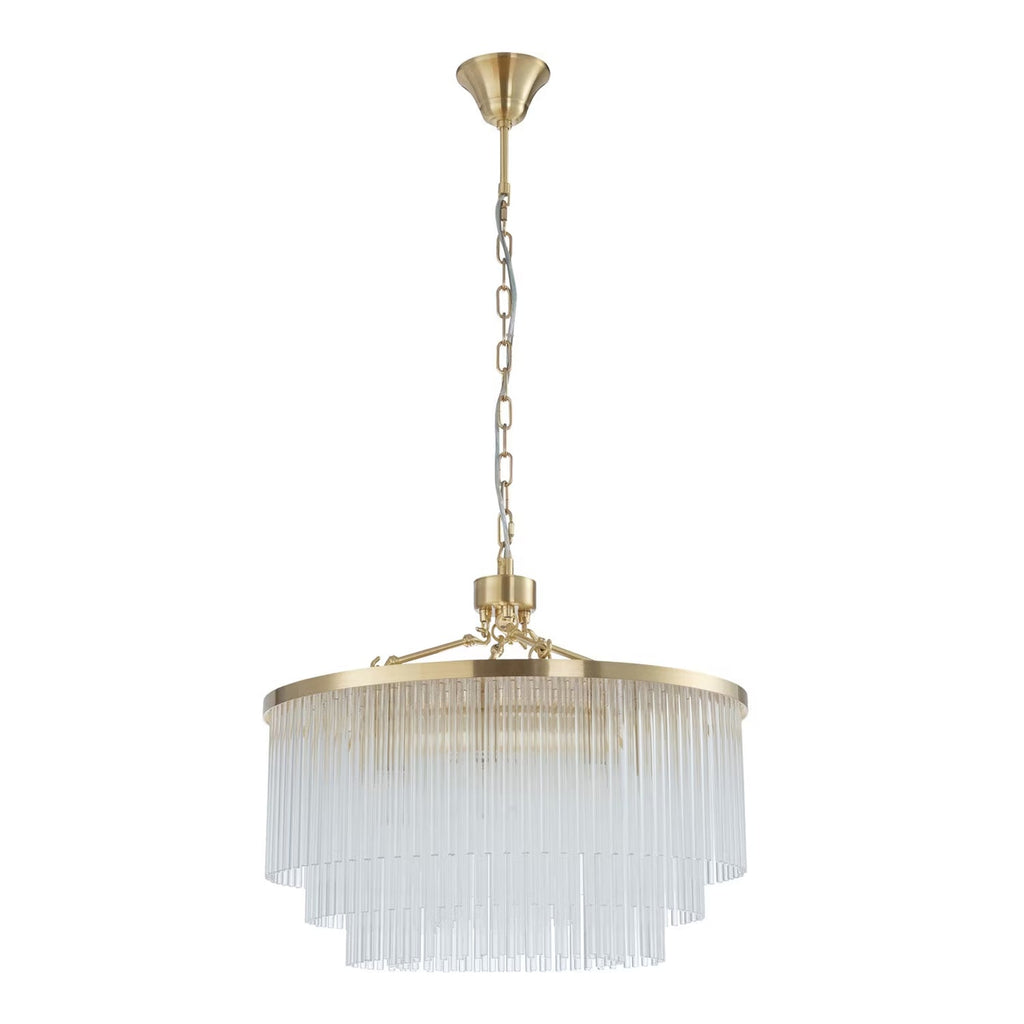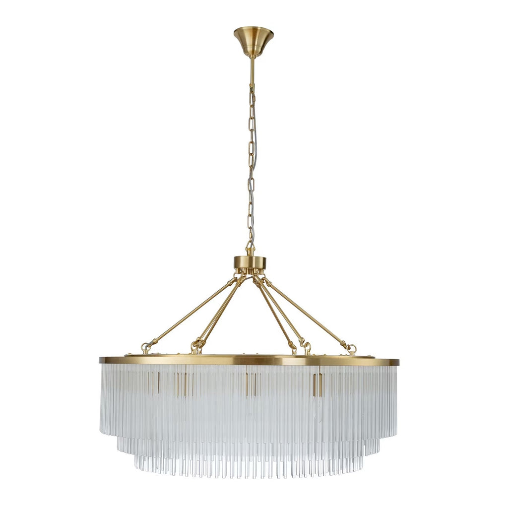 Discover the Evangeline Chandelier range , a statement in modern elegance and timeless glamour. Finished in luxurious satin brass, each chandelier features cascading strands of clear glass rods that delicately catch and reflect the light, creating a warm, radiant atmosphere. Whether placed in a grand entryway or above a dining table, its refined silhouette adds a sophisticated focal point to any space. Available in three sizes to suit various room scales, the Evangeline brings a sense of luxury and drama to both modern and classic interiors.