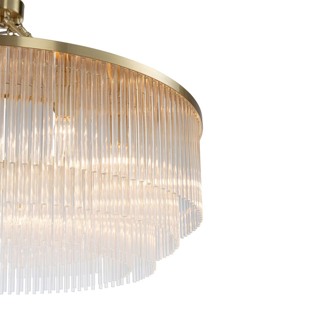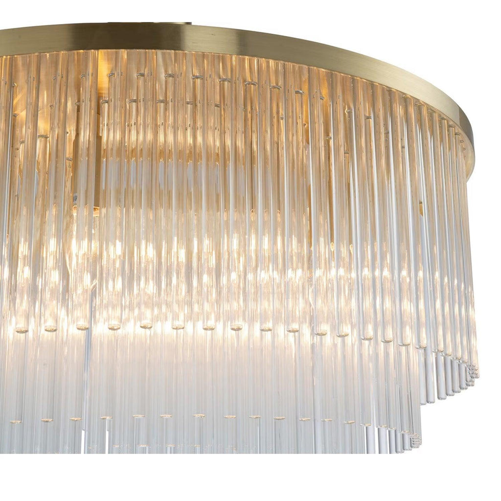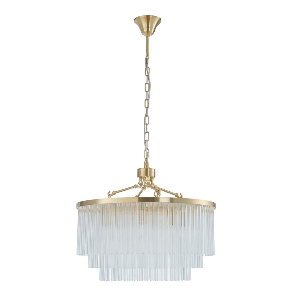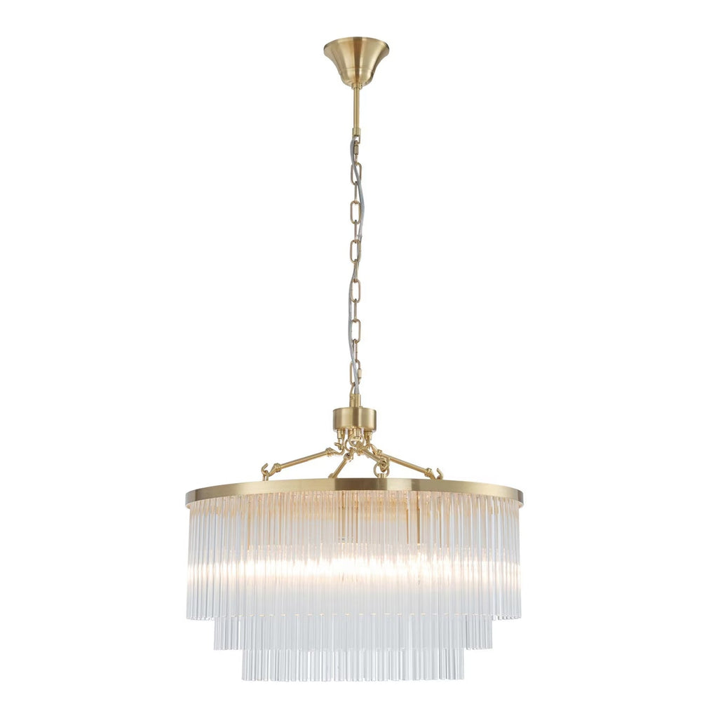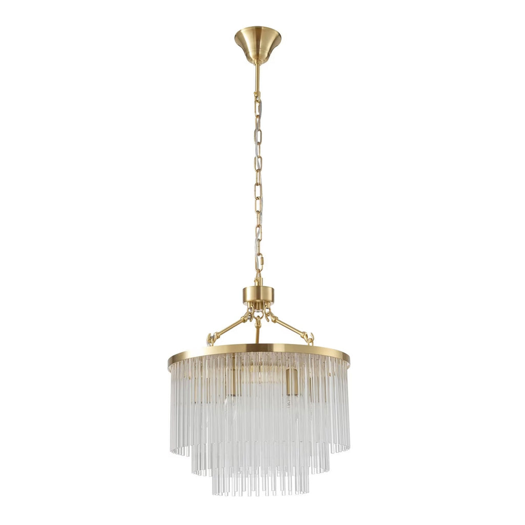 Discover the Evangeline Chandelier range , a statement in modern elegance and timeless glamour. Finished in luxurious satin brass, each chandelier features cascading strands of clear glass rods that delicately catch and reflect the light, creating a warm, radiant atmosphere. Whether placed in a grand entryway or above a dining table, its refined silhouette adds a sophisticated focal point to any space. Available in three sizes to suit various room scales, the Evangeline brings a sense of luxury and drama to both modern and classic interiors.