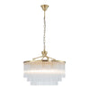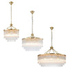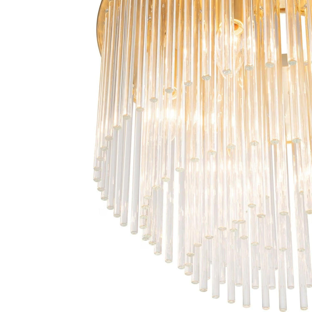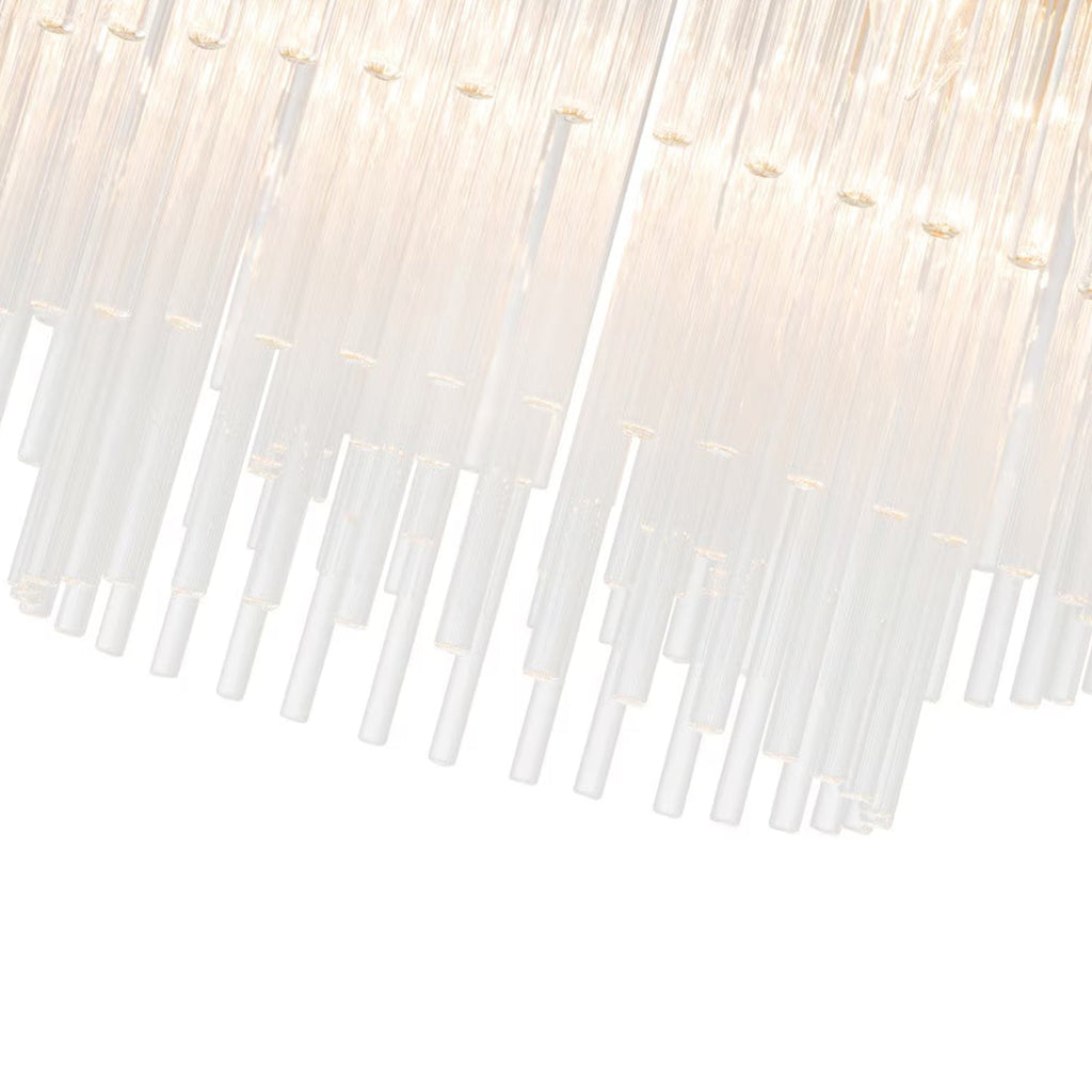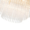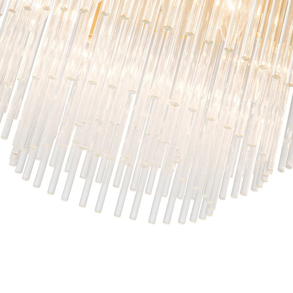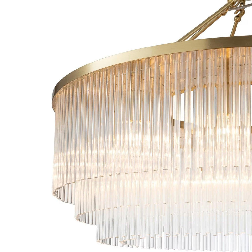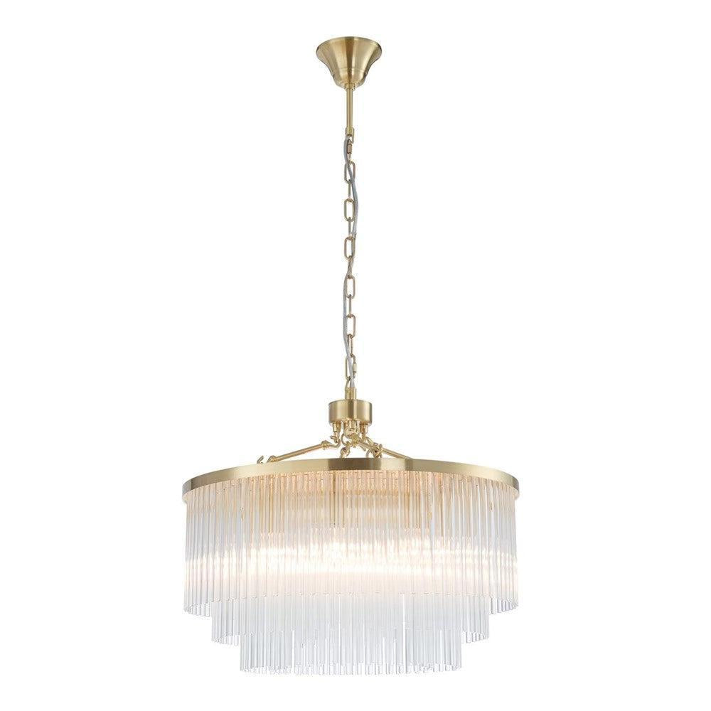Discover the Evangeline Chandelier range , a statement in modern elegance and timeless glamour. Finished in luxurious satin brass, each chandelier features cascading strands of clear glass rods that delicately catch and reflect the light, creating a warm, radiant atmosphere. Whether placed in a grand entryway or above a dining table, its refined silhouette adds a sophisticated focal point to any space. Available in three sizes to suit various room scales, the Evangeline brings a sense of luxury and drama to both modern and classic interiors.