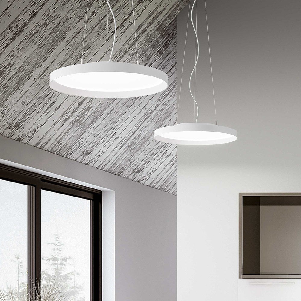 Circular LED suspension lamps available in four different diameters (350 mm, 450 mm, 600 mm, 900 mm) as well as in the SLIM variant with a more compact height. Light body in powder-coated aluminium.