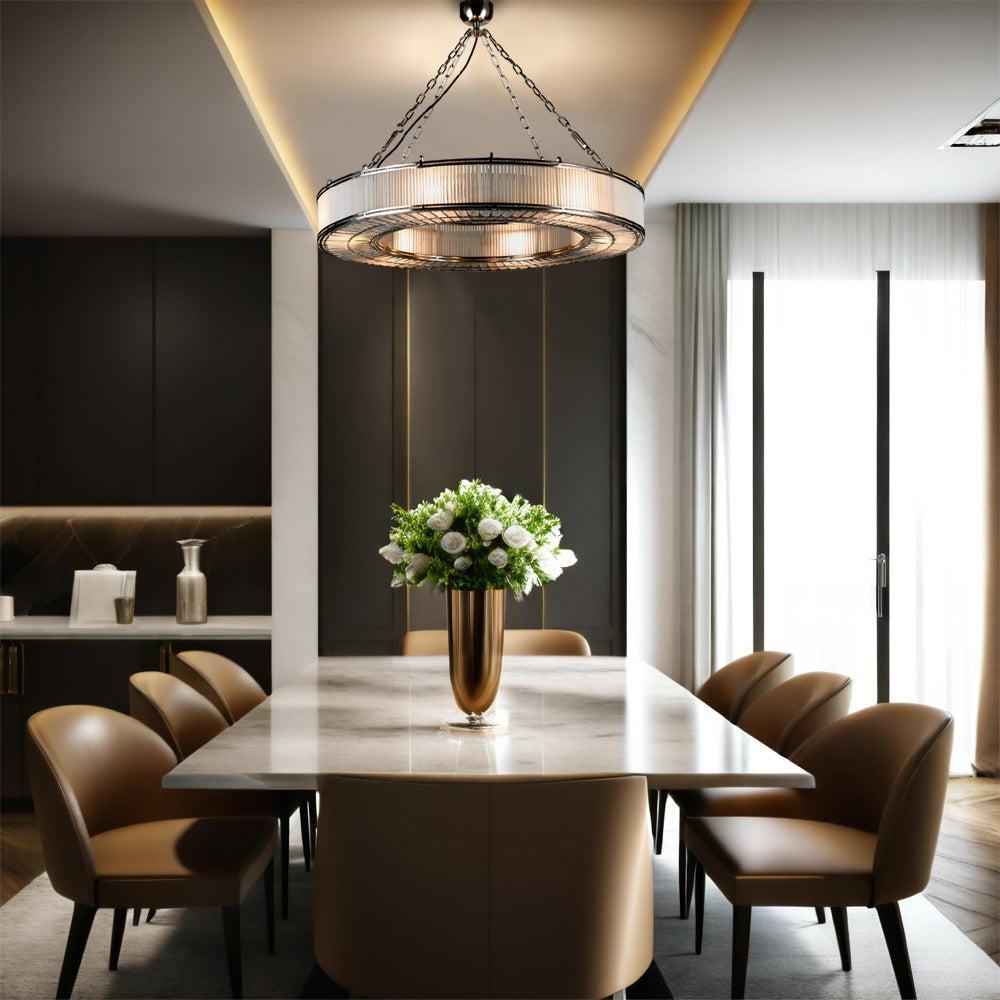 The Franschhoek pendant light is a stunning ring of glass with a nickel finish. Designed in a contemporary New York style, ceiling lamp is perfect for hanging over dining tables or as a feature light in all spaces.