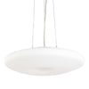 Rosette finished in satin nickel. Blown and etched white glass diffuser. Suspensions with steel cables adjustable in length with automatic devices.