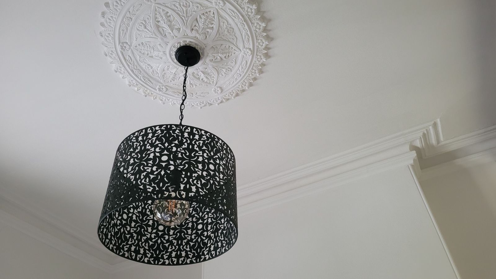 Our popular Vicky range is stunning when lit, as the cut-out design in the shade is reflected onto the ceiling or wall. This Vicky pendant features a matt black/ matt white powder coated metal shade, suspended on a chain and stylish canopy. Vicky is also available in other sizes and wall lights.