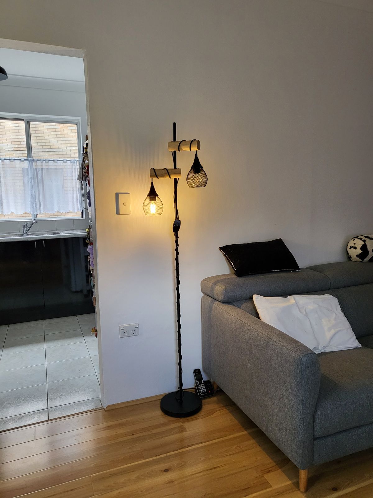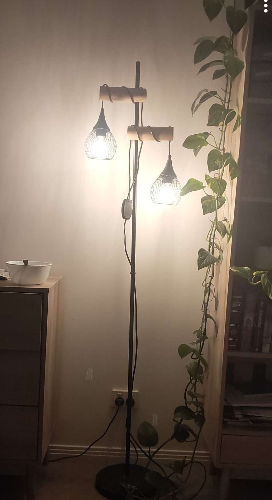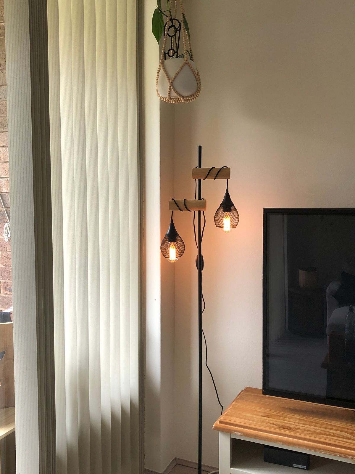 You will be industrial if you pick up this beauty! A nice surprise - the wooden parts do move so you can have the placement of the hanging globes where you want. Two lights make it practical as well as you decide how bright you need the space. I have actually curled the cord around the pole and it just adds another 'design' touch. Best of all is the height of the switches - just put my arm out over the couch and turn it on or off! And of course, you get to choose the globes that best suit your style as well - you may even like to go bold and take off the mesh cover and just hang oversized bulbs!