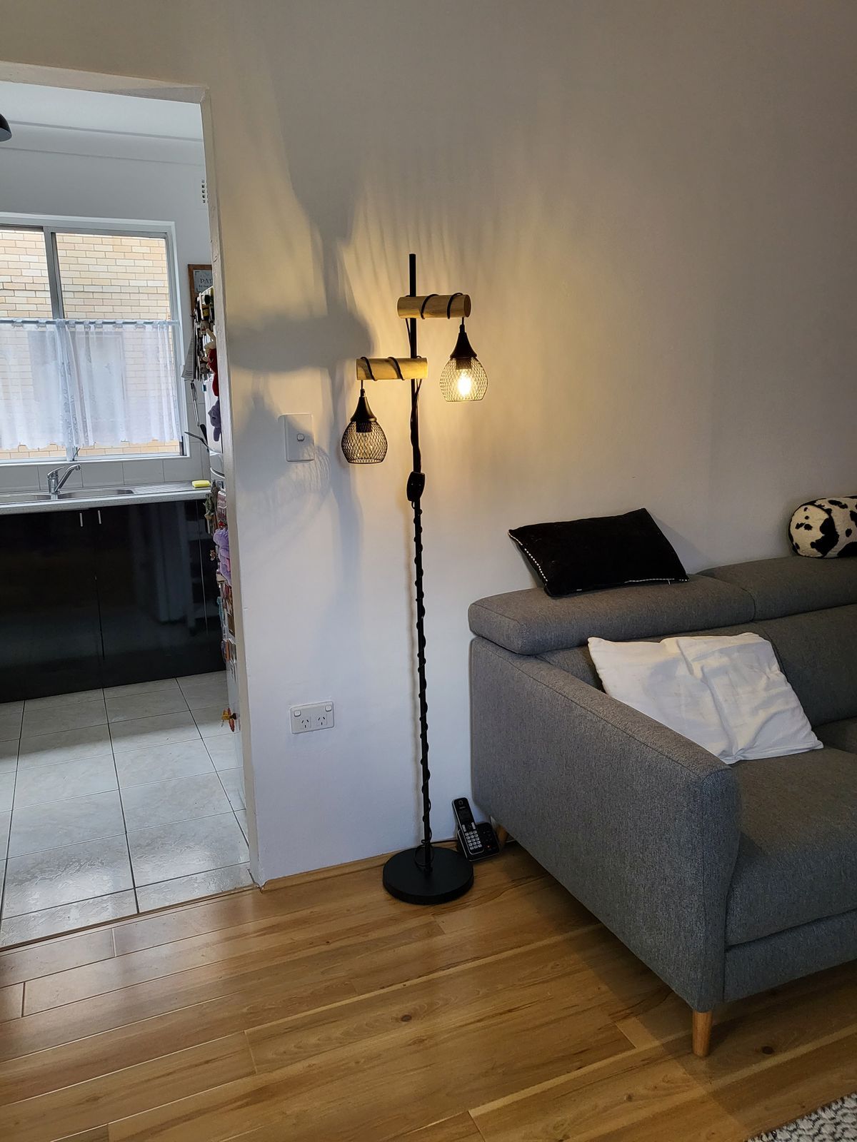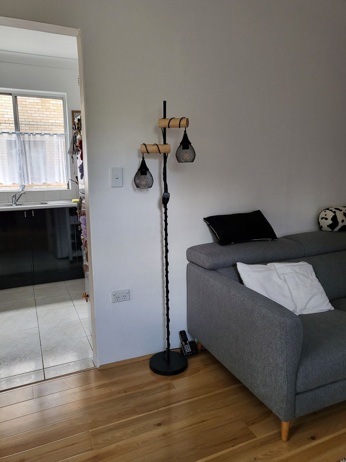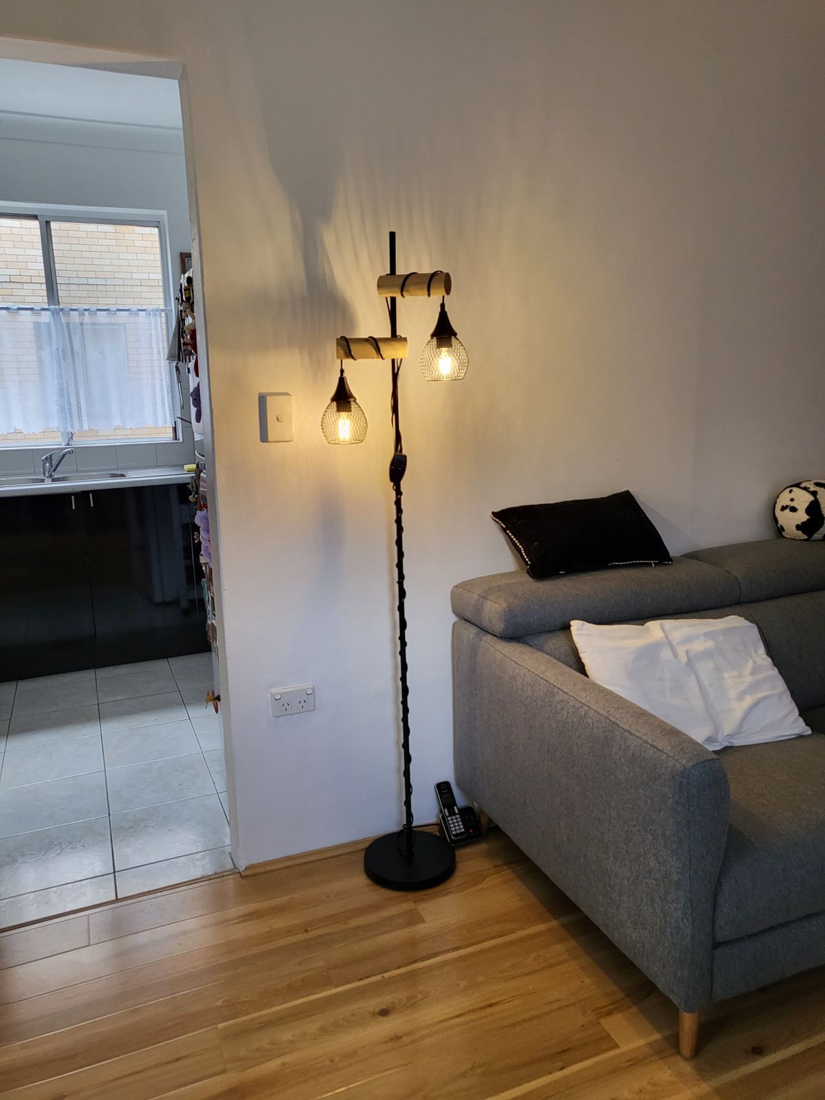You will be industrial if you pick up this beauty! A nice surprise - the wooden parts do move so you can have the placement of the hanging globes where you want. Two lights make it practical as well as you decide how bright you need the space. I have actually curled the cord around the pole and it just adds another 'design' touch. Best of all is the height of the switches - just put my arm out over the couch and turn it on or off! And of course, you get to choose the globes that best suit your style as well - you may even like to go bold and take off the mesh cover and just hang oversized bulbs!