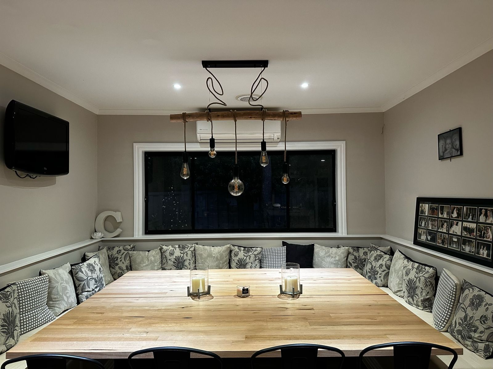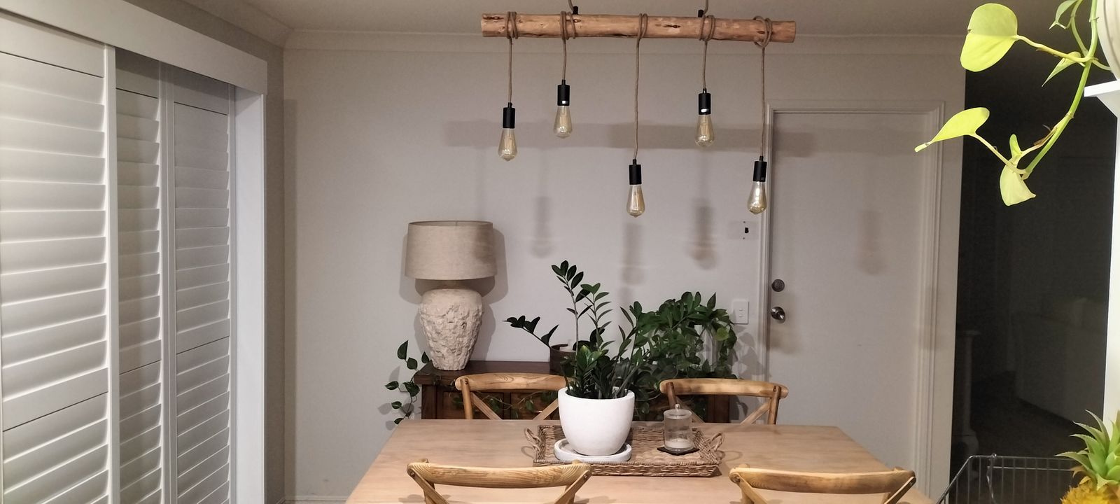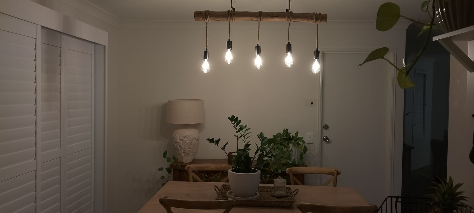 The Lea lighting series offers a natural, rustic feel utilising a natural timber body with black metal bases and mounts and natural fibre rope dressed power cables. The Lea Pendant Lamp suspends from its base with slimline cable hidden by the natural rope power lines, suspending four-rope globes from a natural wood hanger.