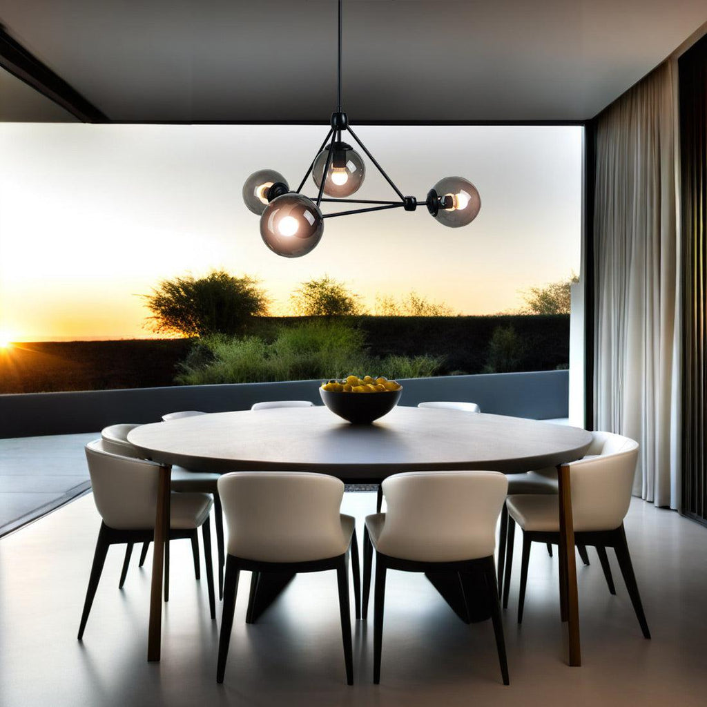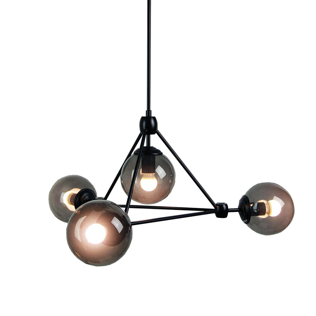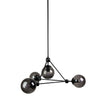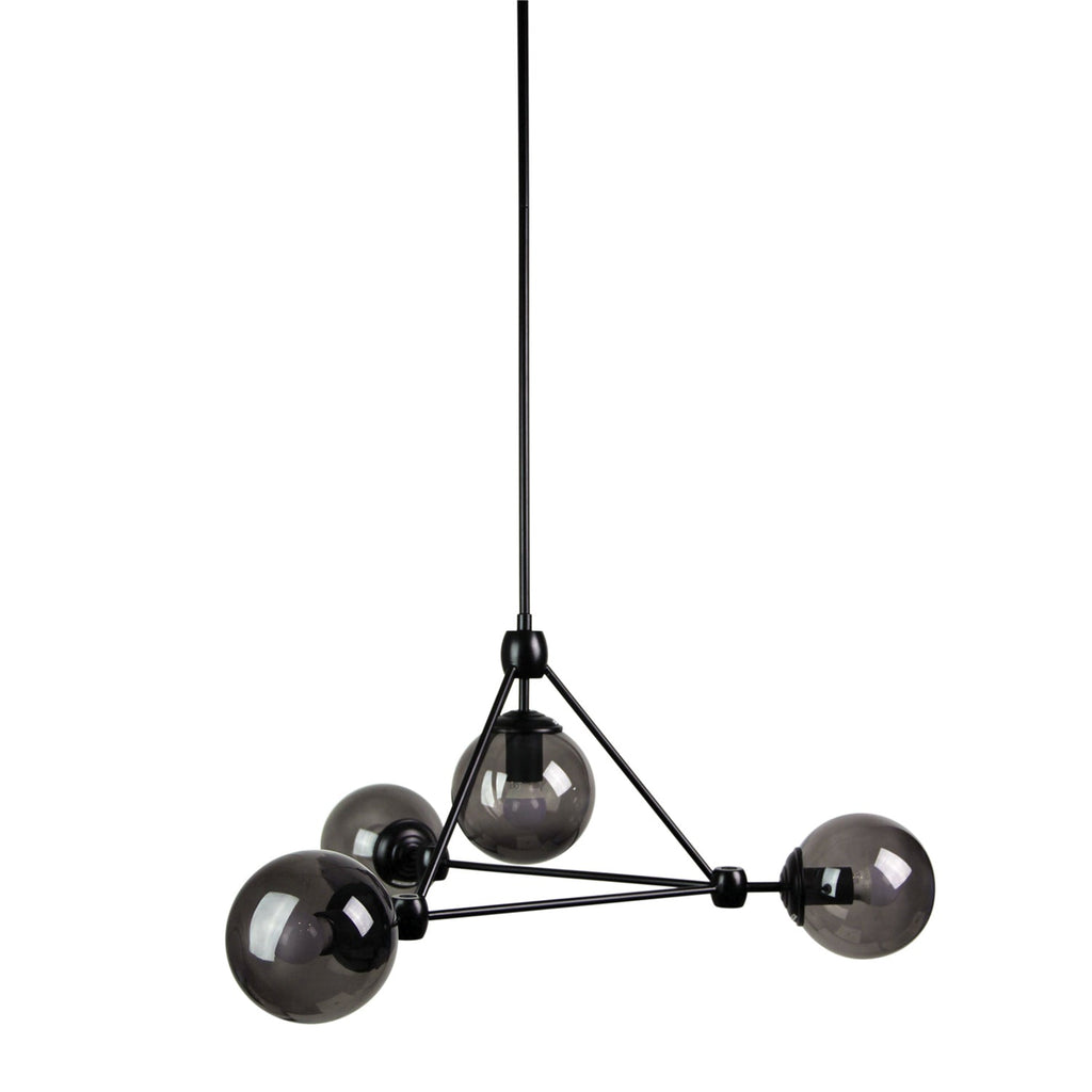 LUNAR 4 light pendant will appease your geometric design needs. Matt black metal rods are joined into a geometric shape, holding four smoked glass spheres. Supplied with two lengths of rod (which can be shortened) allowing for installation at any height between 400 to 1260mm. Some assembly required. A statement piece, the LUNAR is ideal for a stairwell/entry or dining table.