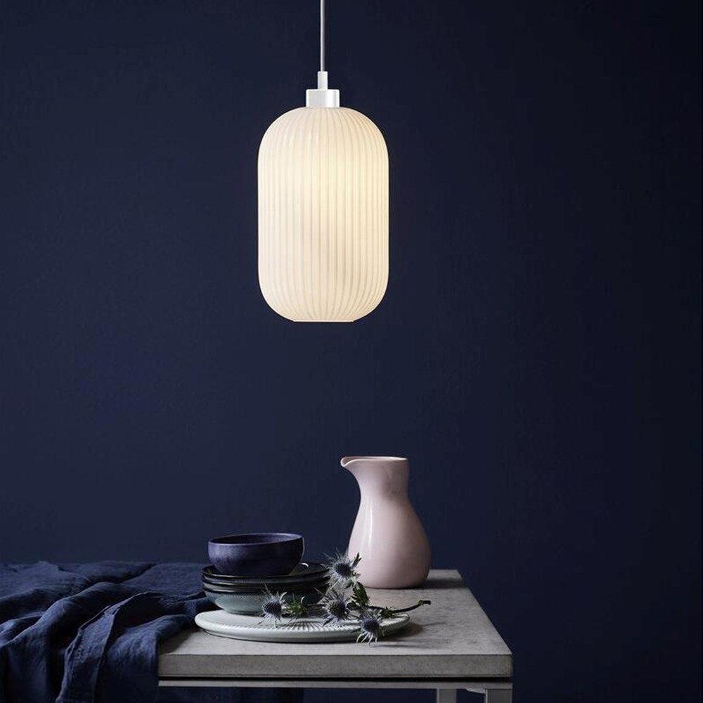 Pendant light made from white ribbed glass. Also available in another shape/size. Rated IP20.