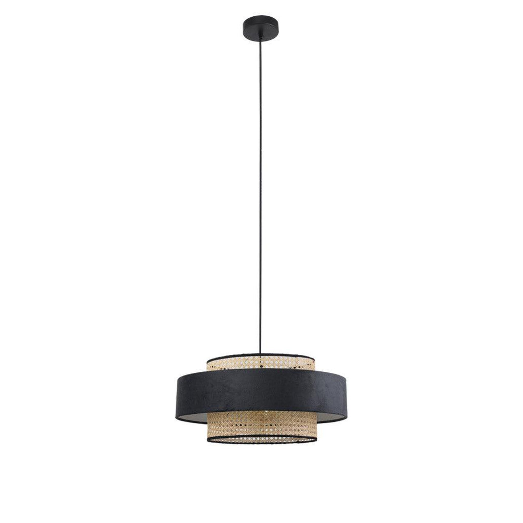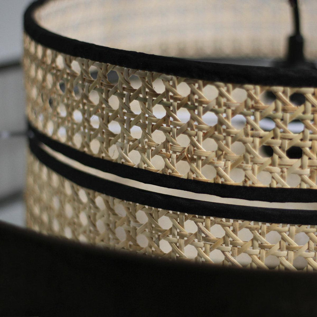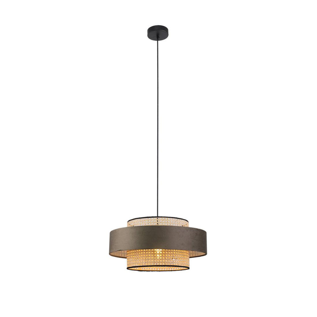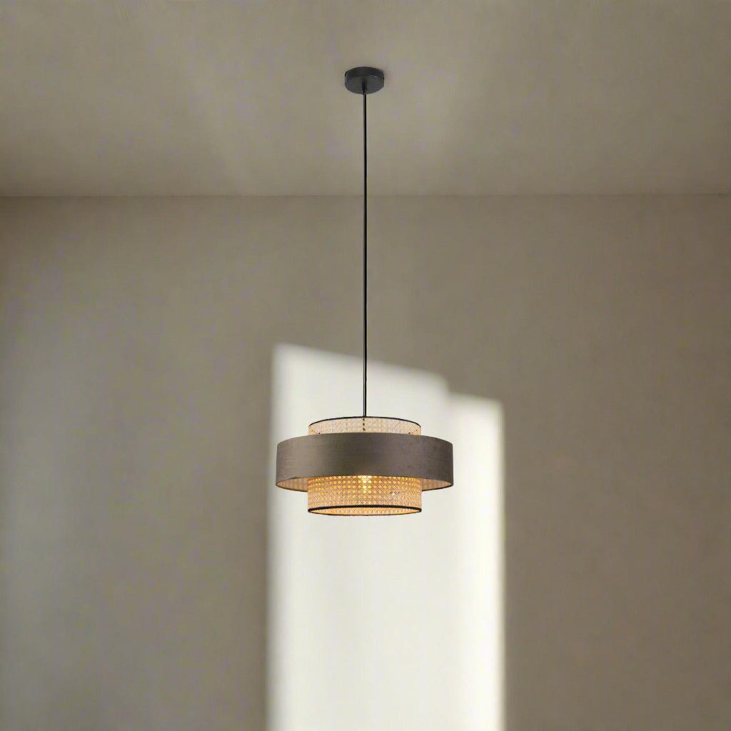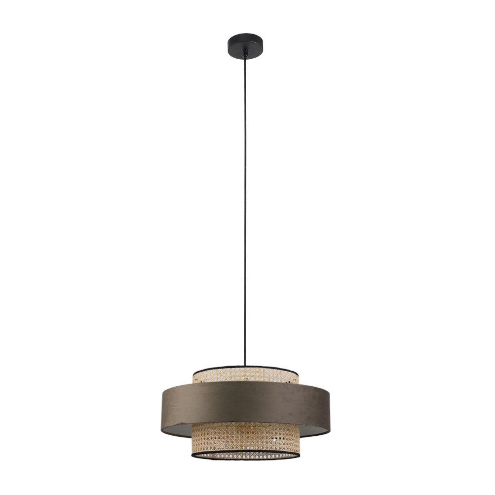 The Miquita Pendant Light is beautifully designed with sophistication and detail, mixing different materials, colours and textures. From the woven rattan drum shade with attractive black trims to the stunning brown velvet feature ring that surrounds the shade, this pendant is made to perfection.