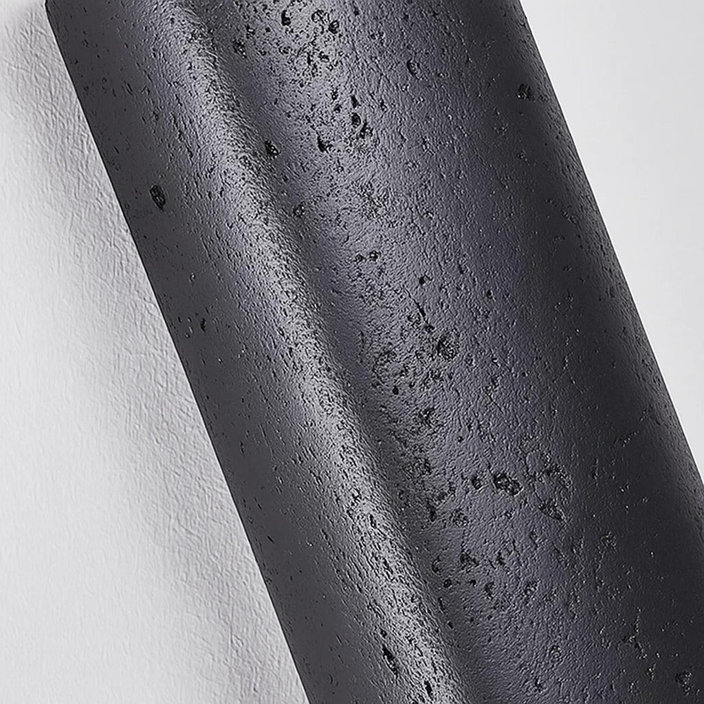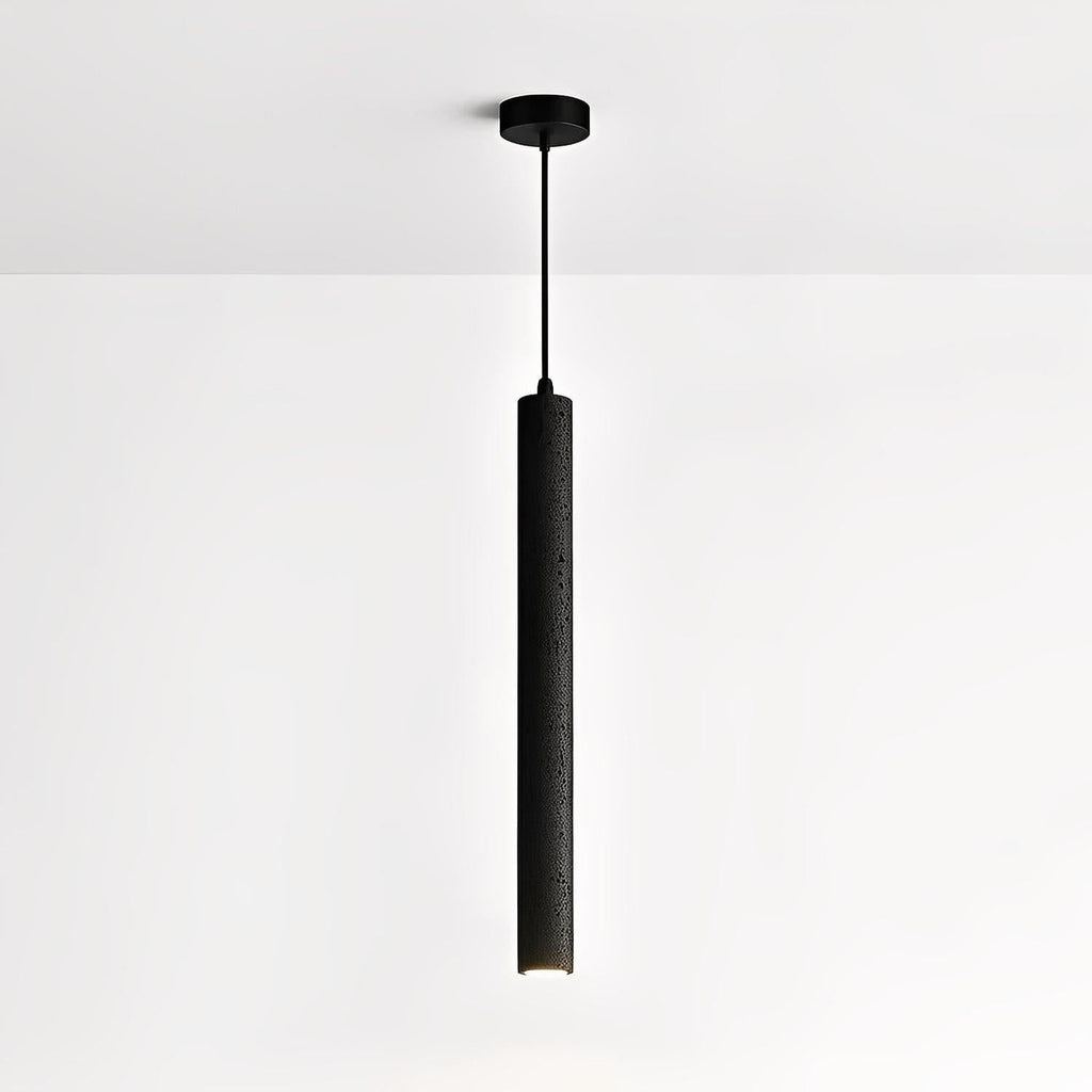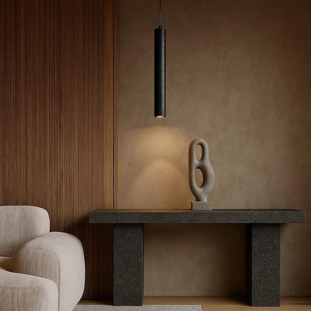 The Moss Pendant Light in Black Stone is a slender pendant featuring a GU10 fitting, offering subtle downward light through a hand-shaped stone cylinder. Finished with a braided cord and matching canopy in walnut tone.