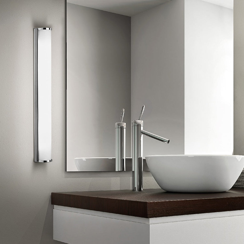 Wall and ceiling lamp in satin finish triplex opal blown glass. Chrome metal parts. Omega has IP44 protection, making it ideal for bathrooms and installation above mirrors.