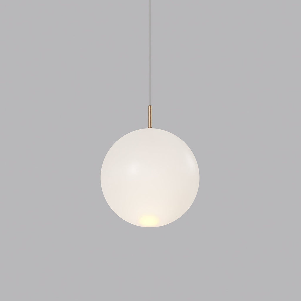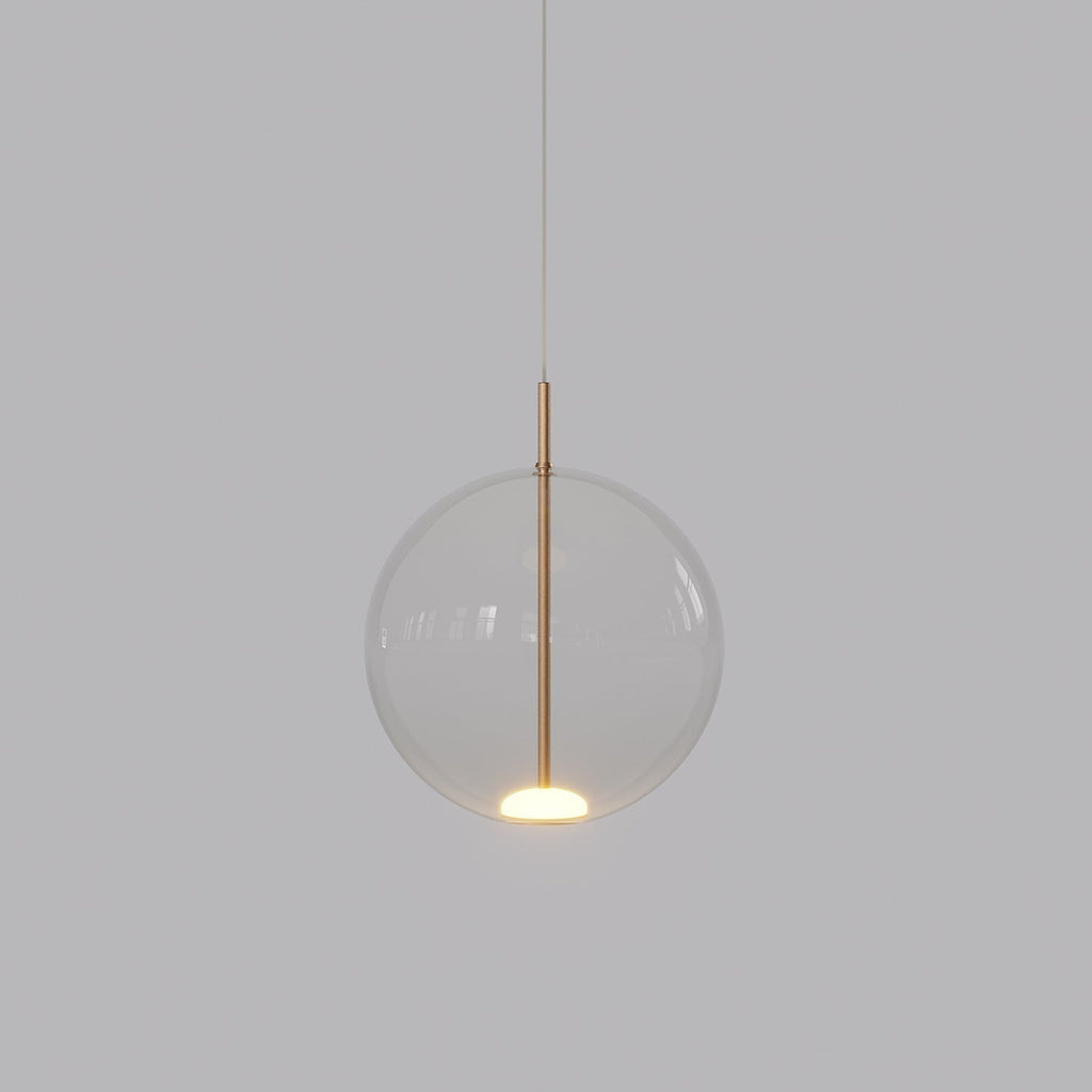 Orb Air Pendant Light showcases a whisper-thin glass sphere, meticulously crafted to evoke a sophisticated weightlessness. A refined brass rod intersects the sphere, housing a radiant LED light source.