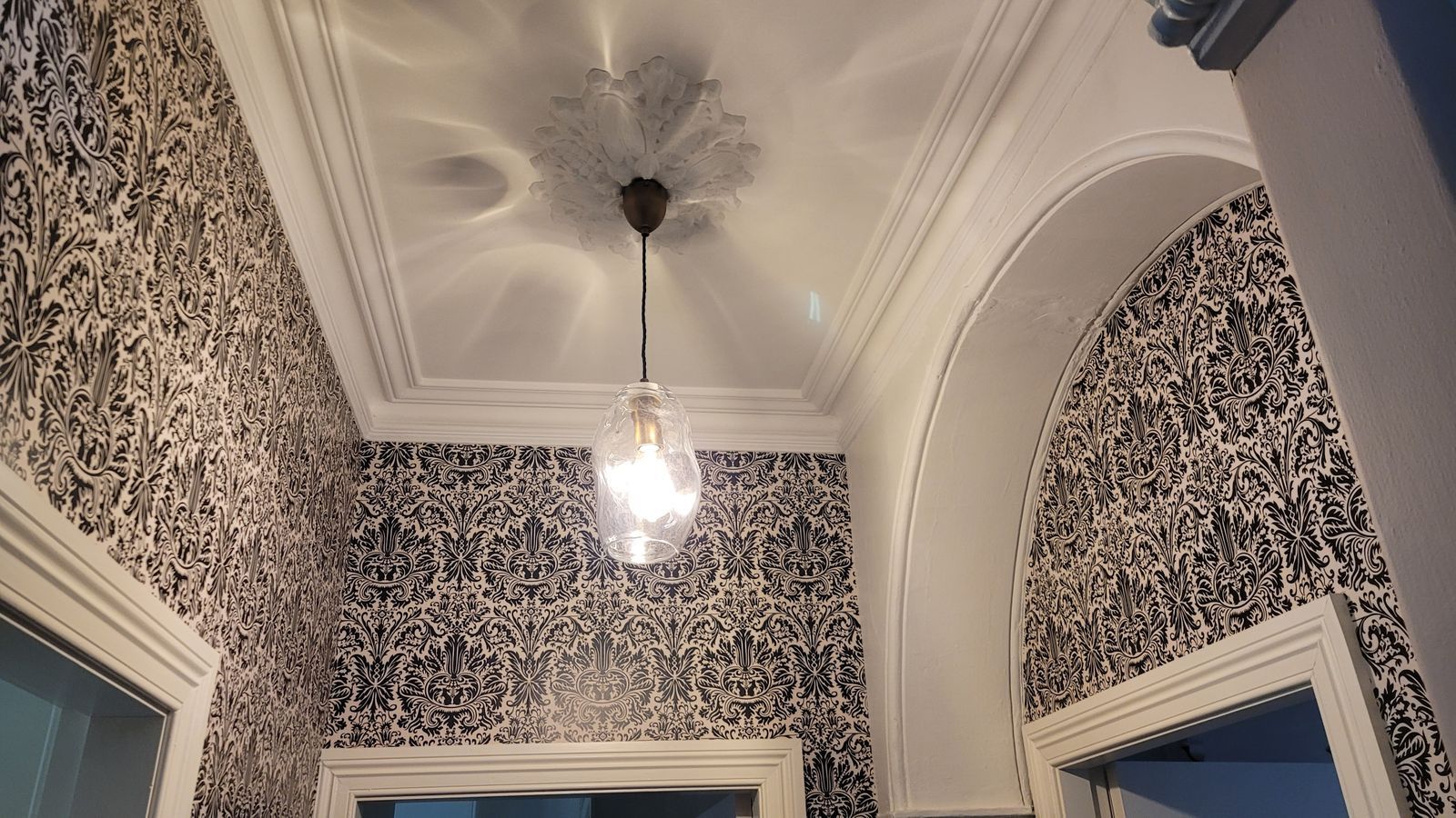 Featuring an old brass or iron indoor suspension fixture and threaded rod suspension system. The shade hangs from a delicate, twisted black cloth cord cable.
