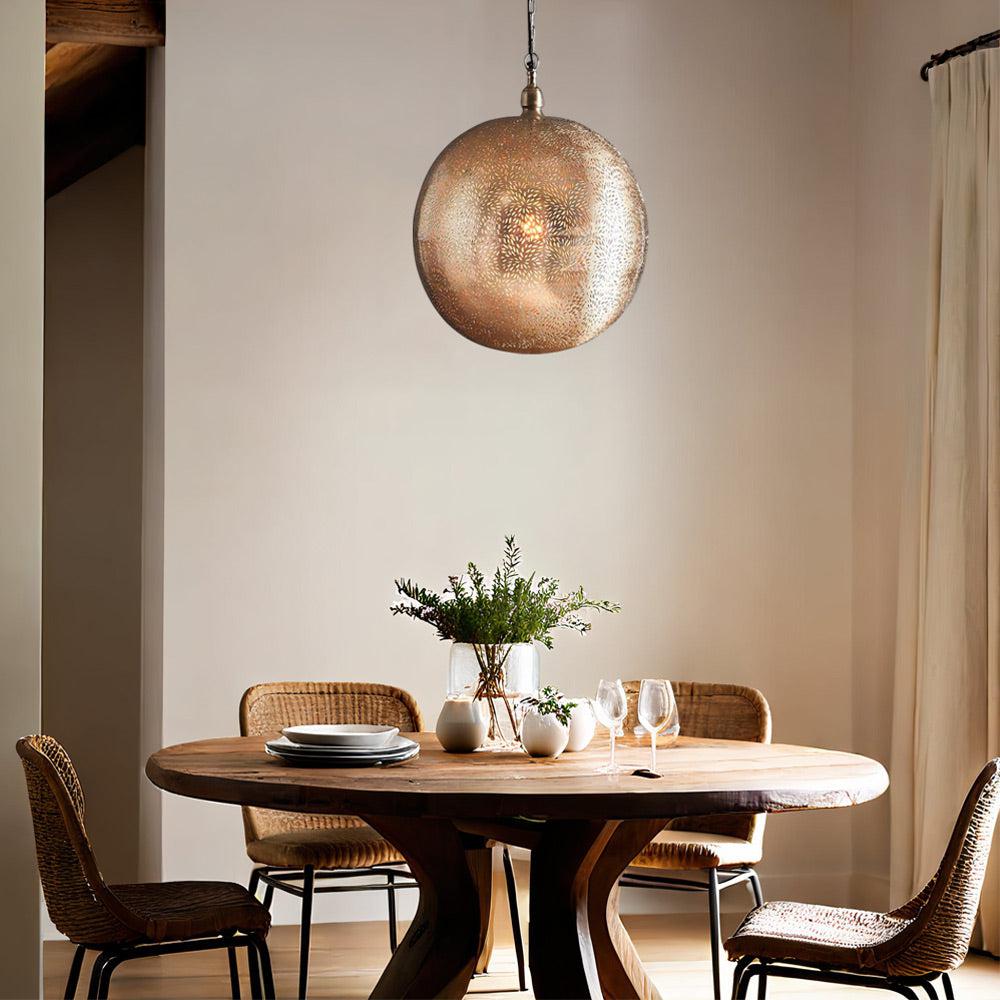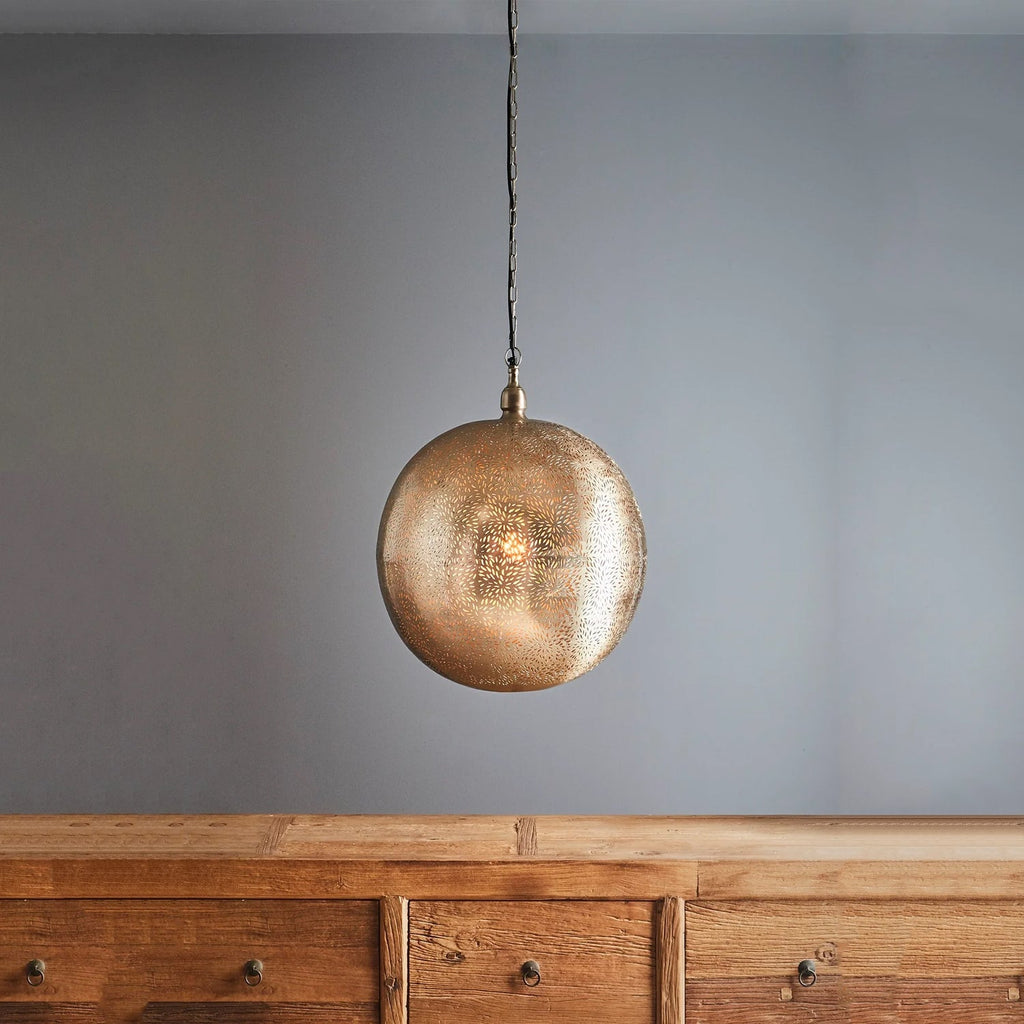 A large round nickel pendant featuring a delicately perforated patterned design. When unlit the metallic silver exterior shows the delicate perforations, when illuminated the glowing gold interior radiates out.