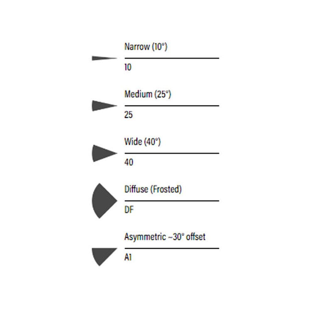 • Beam Angle: 10° / 25° / 40° / Diffuse Frosted (DF) / Asymmetric ~30° offset (A1)