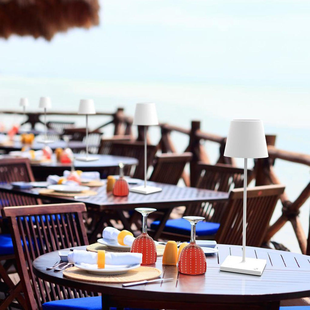 A rechargeable table lamp with a matt white or corten painted aluminium fixture, a polycarbonate diffuser and a LED light source. The Poldina collection has IP54 protection, making it ideal for indoor and outdoor use. Battery life is guaranteed for more than 9 hours.