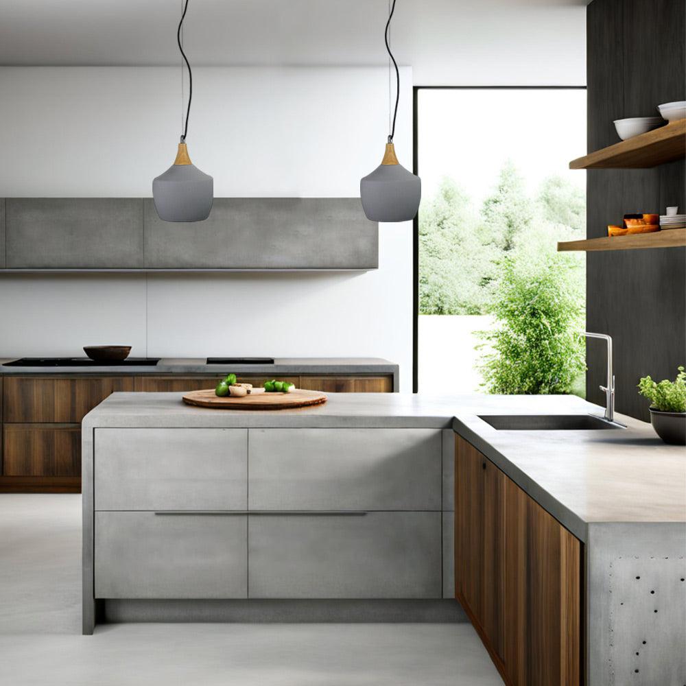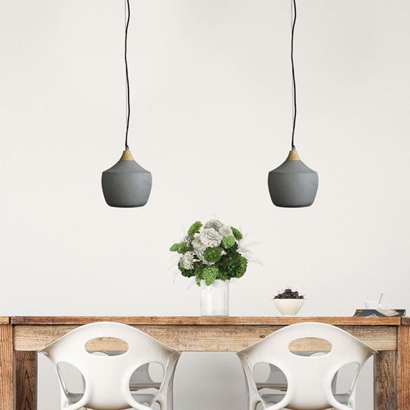 Panto concrete-finished pendant is ideally hung in a row over a bar, or kitchen servery. The ceiling mount canopy and top cap of the pendant are made from real timber, which contrasts beautifully with the rawness of the concrete finish and the black cloth covered cord. Panto is also available in other shapes, making it suitable for clustering or combining with other pendants in our Scandustrial range.