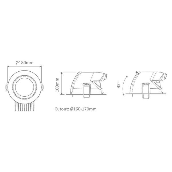 Added benefits of up to 45° tilt function and fully mains dimmable LED driver makes this a perfect alternative to metal halide and CFL style down lights.