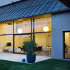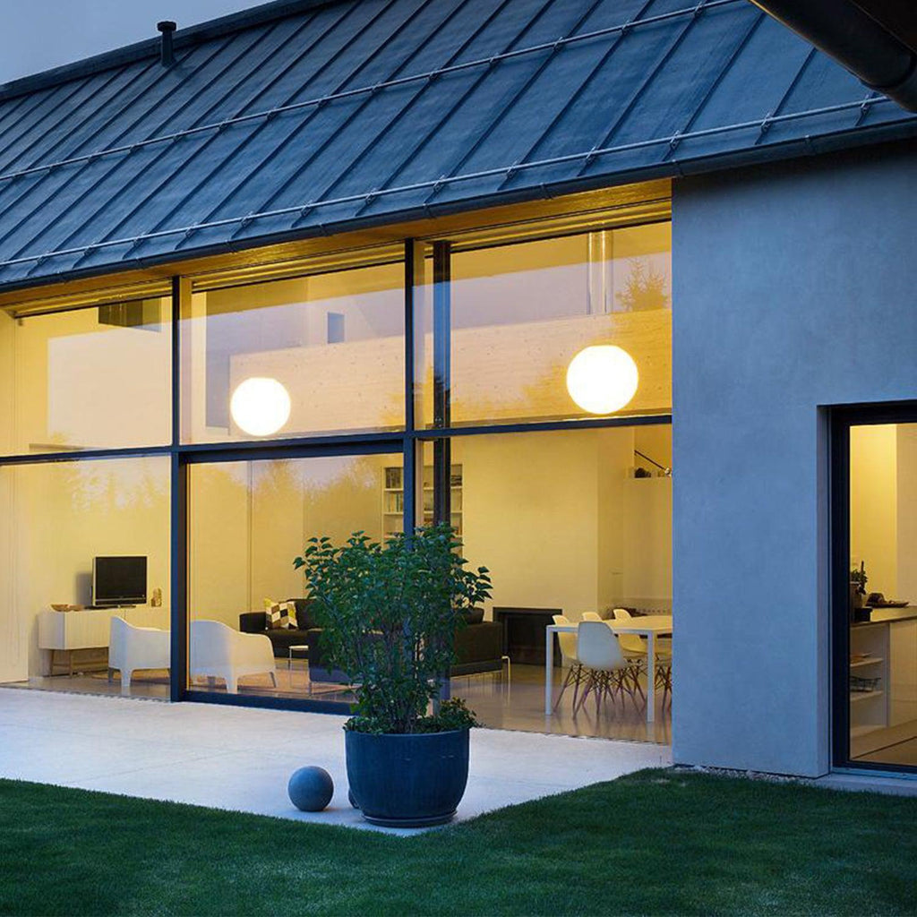A collection of hanging, ceiling and table lamps in satin finish triplex opal blown glass. Metal parts with chrome, brushed brass finish or matt white painted. IP44 protection available on request