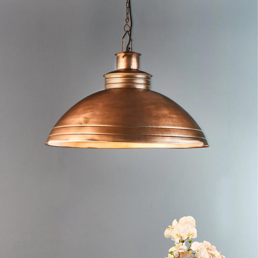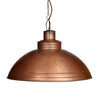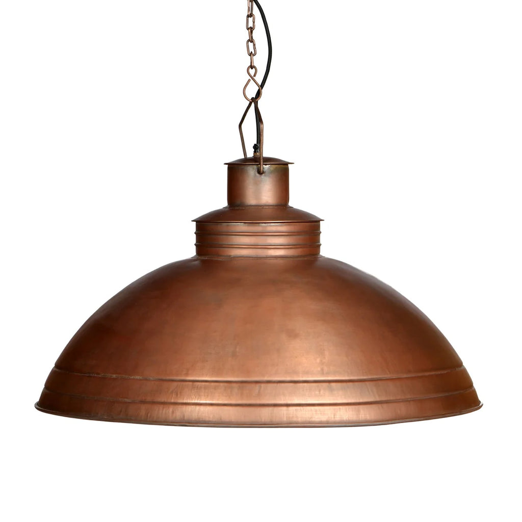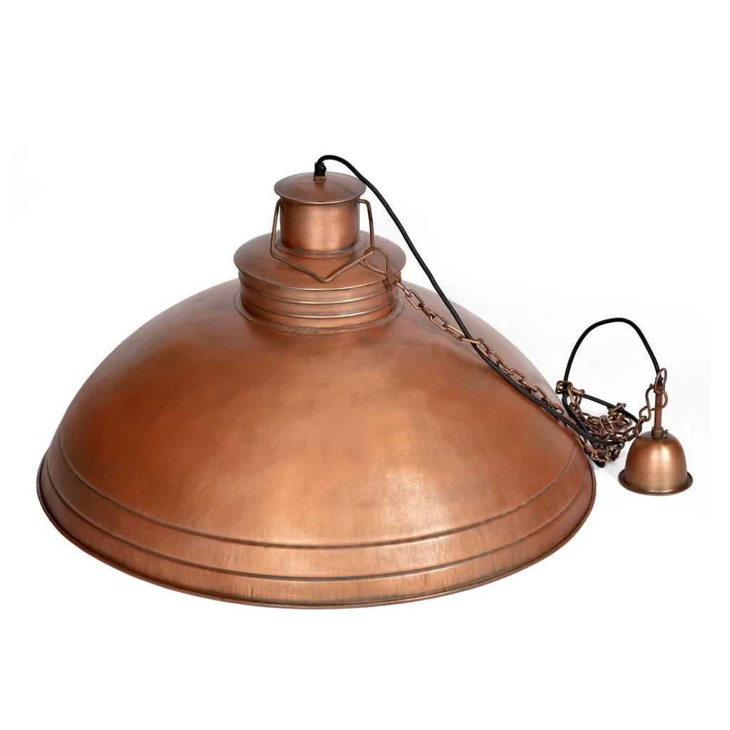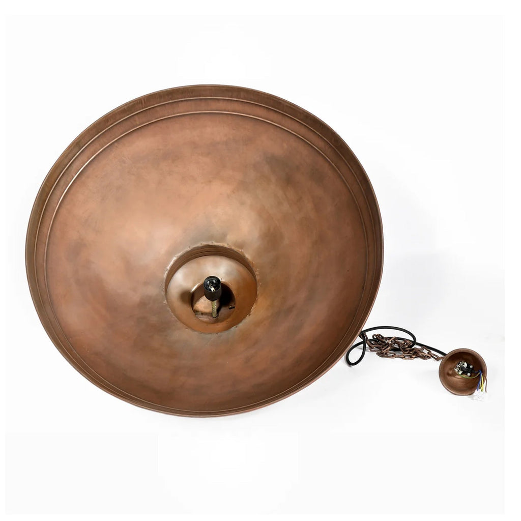 A stunning large and light weight dome pendant in an antique copper plate. This pendant is a perfect balance between the hard metallic finish and soft curving lines.