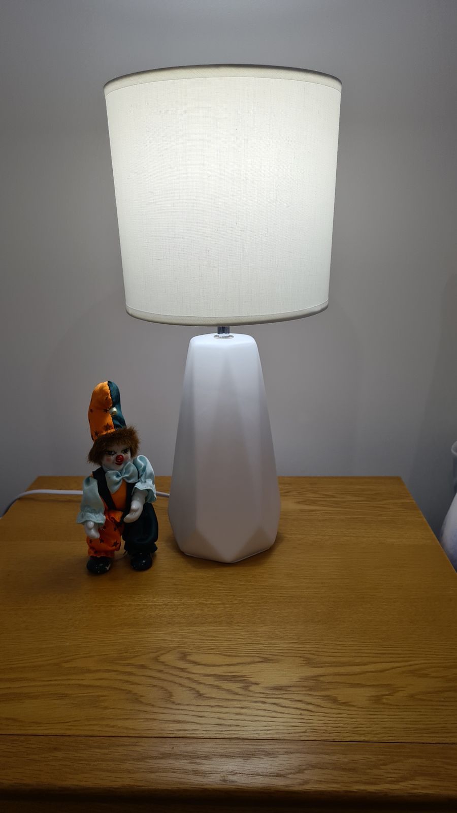 SHELLY ceramic table lamp complete with fabric shade. The multi-faceted base has a matt finish and is supplied with a matching poly-cotton laminated shade. Switch is conveniently on the cord. At 45cm high, SHELLY makes an ideal bedside lamp. Black shade, with a white lining.