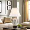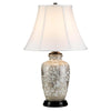 Chinese Porcelain table lamp with a Silver floral pattern over a White crackle glaze. Fitted with a wooden cap and base, White polycotton empire shade, and Satin Nickel finial.