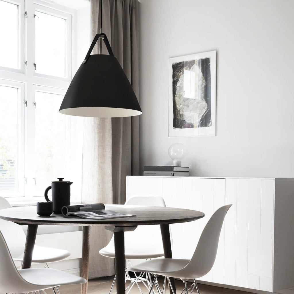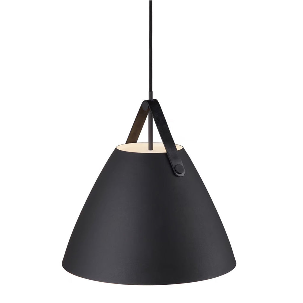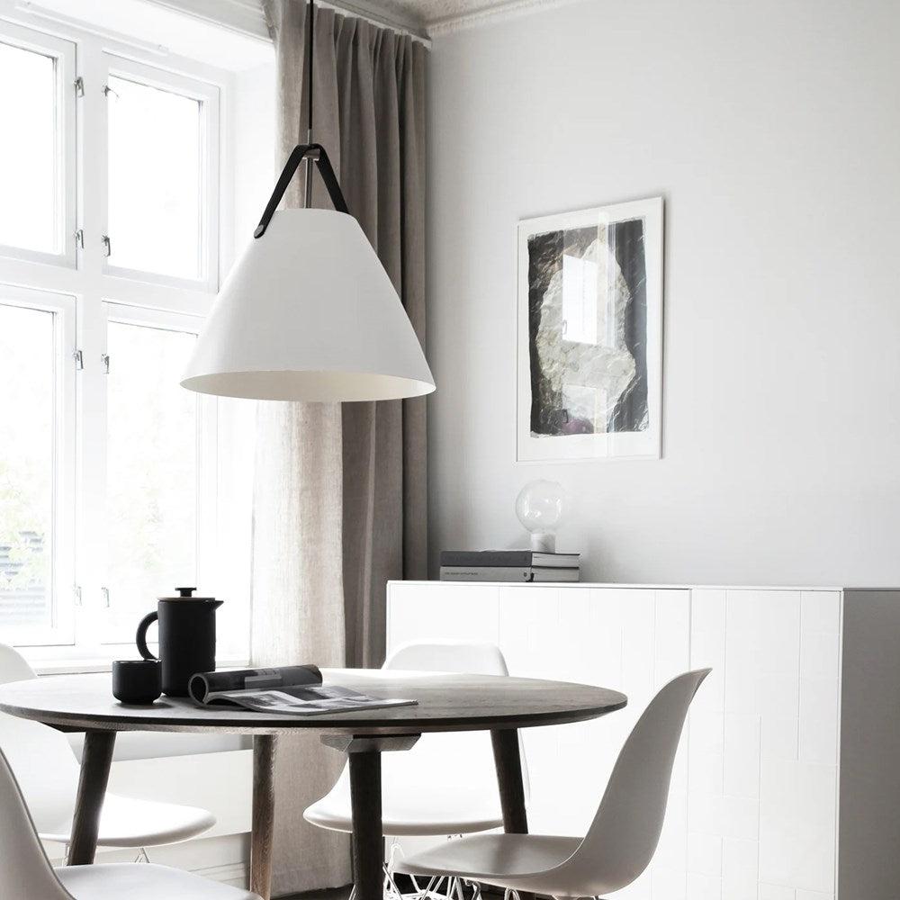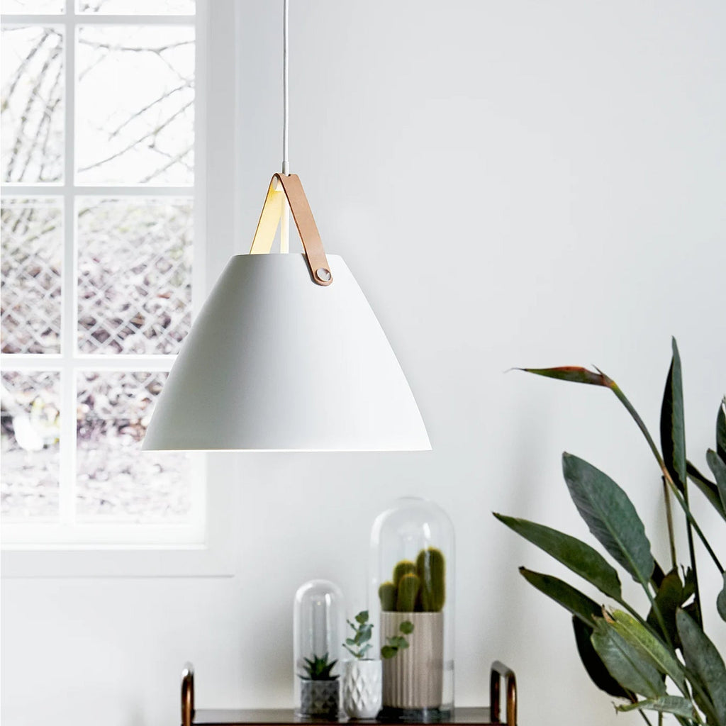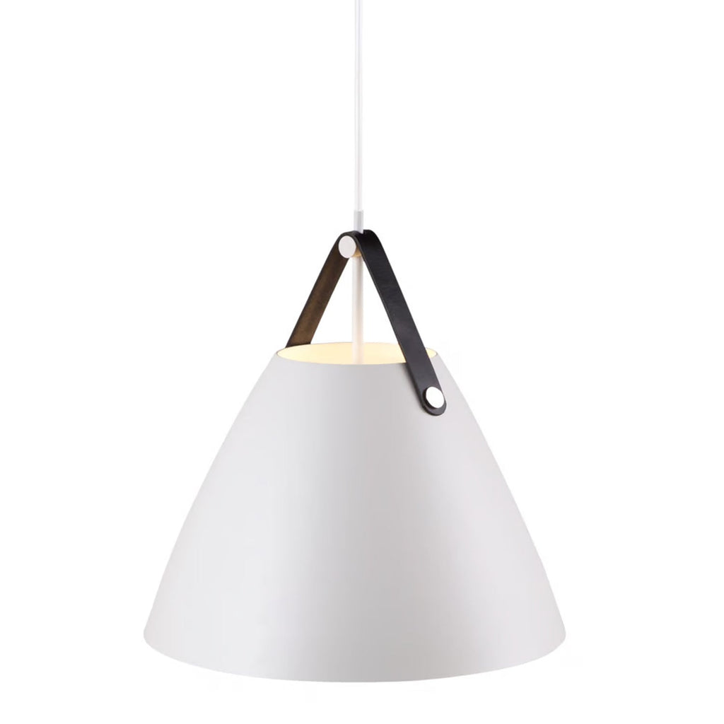 An award winning design, Strap pendant is available in black, white, brushed steel and dark beige. Also available in other sizes. Includes 2 interchangeable leather straps (black and brown). 3000mm fabric cable suspension. Designed in Denmark by Bjørn + Balle