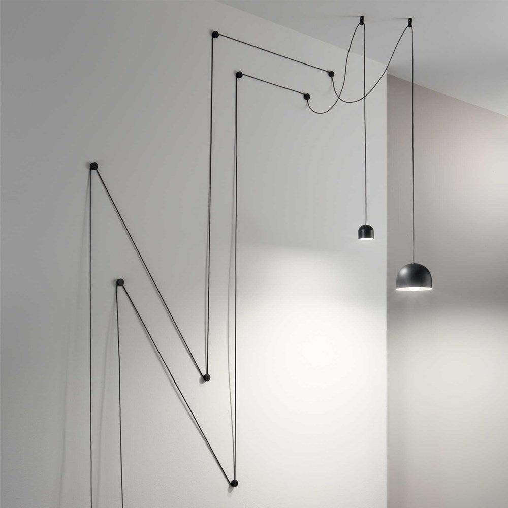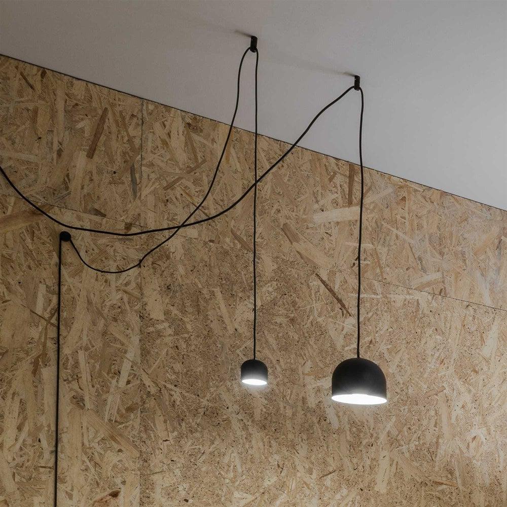 Matt white or black varnished metal diffuser and details. Small models with integrated led and opal color screen. Big models open with replaceable bulb.