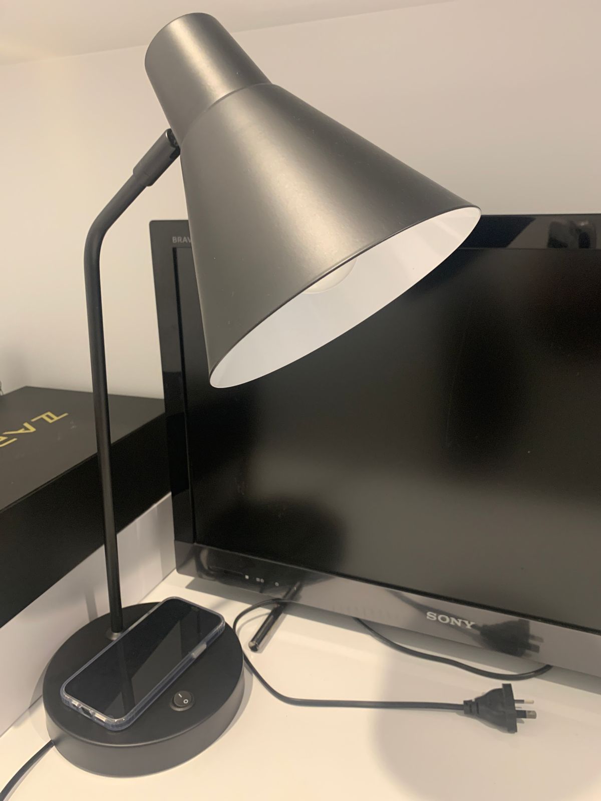 TARGA is an ideal task lamp for desk or bedside. A USB socket for charging devices is positioned on the side of the base. Or charge wirelessly by placing your phone on top of the base. Avaliable in black or white, with a wide adjustable shade perfect for task lighting. On/off switch is located convienently on the base. Ideal for use with an opal LED globe.