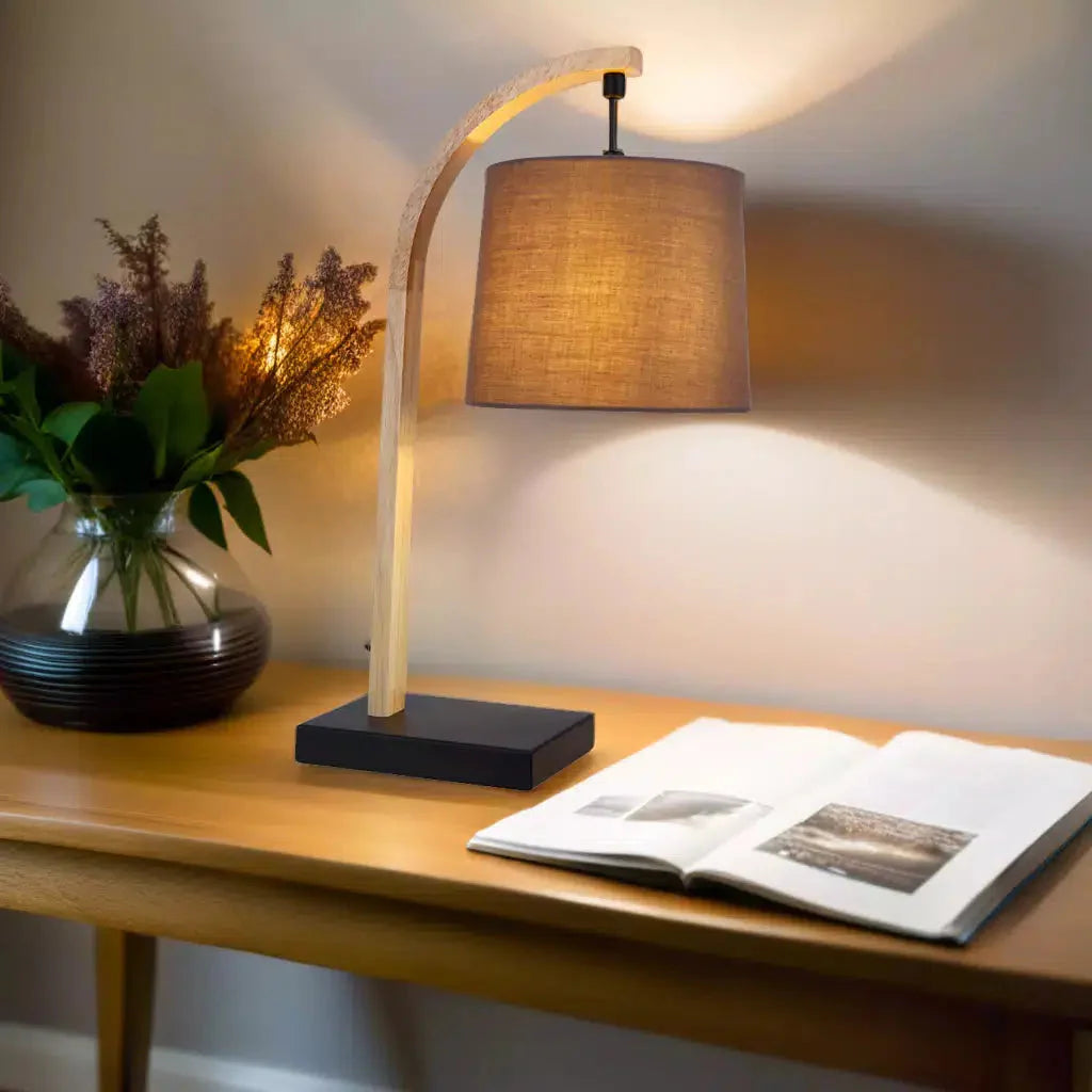 The Thorina Range comprises a table or floor lamp with a simplistic and attractive appearance to suit various home decor surroundings. The three material design includes a solid black rectangular metal base, a thin timber stem that curves at the light’s end and a classic linen shade to complete the humble look.
