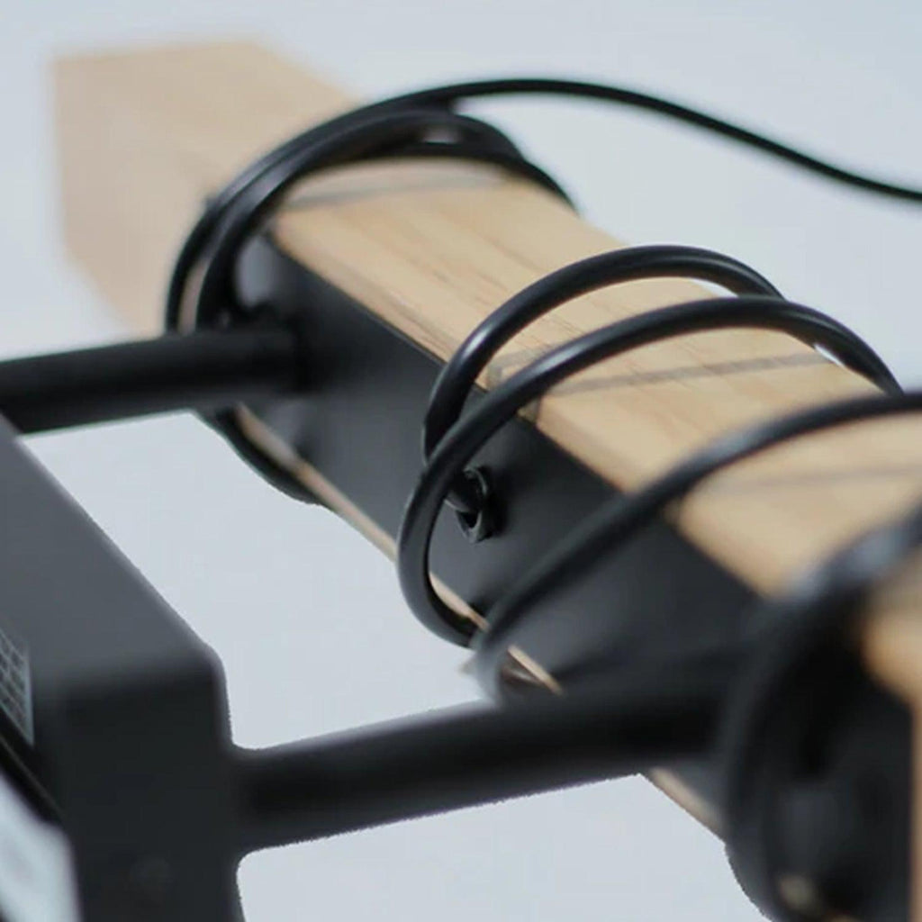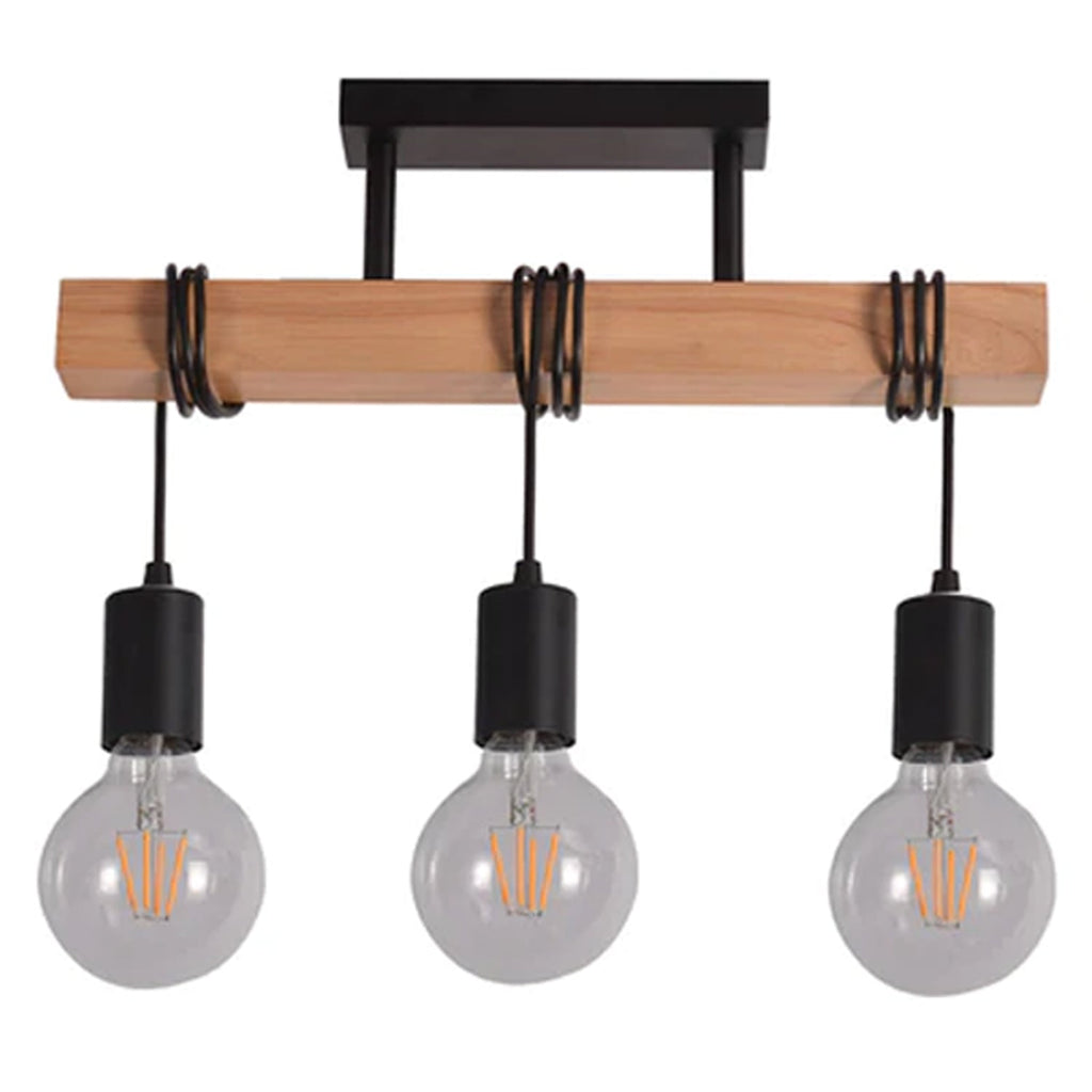 The Tibery Ceiling Light black base holds the timber beam parallel to the ceiling, giving ample light from its three globes. The Tibery Pendant Light suspends a timber beam from two black flexible rods 100cms from a black ceiling mounted base. The six lights are wrapped around the timber and can be left at alternative heights to suit your installation desires, and it is ideal as a kitchen or dining room feature.