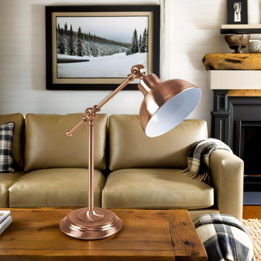 TINLEY-DL desk lamp Series features a slim metal tube design and an adjustable knuckle holding a stylish dome shade. Modern and attractive design ideal for living rooms and bedrooms. Available in Antique Chrome, Antique Brass and Antique Copper. Part of a family of matching desk lamp and floor lamp.