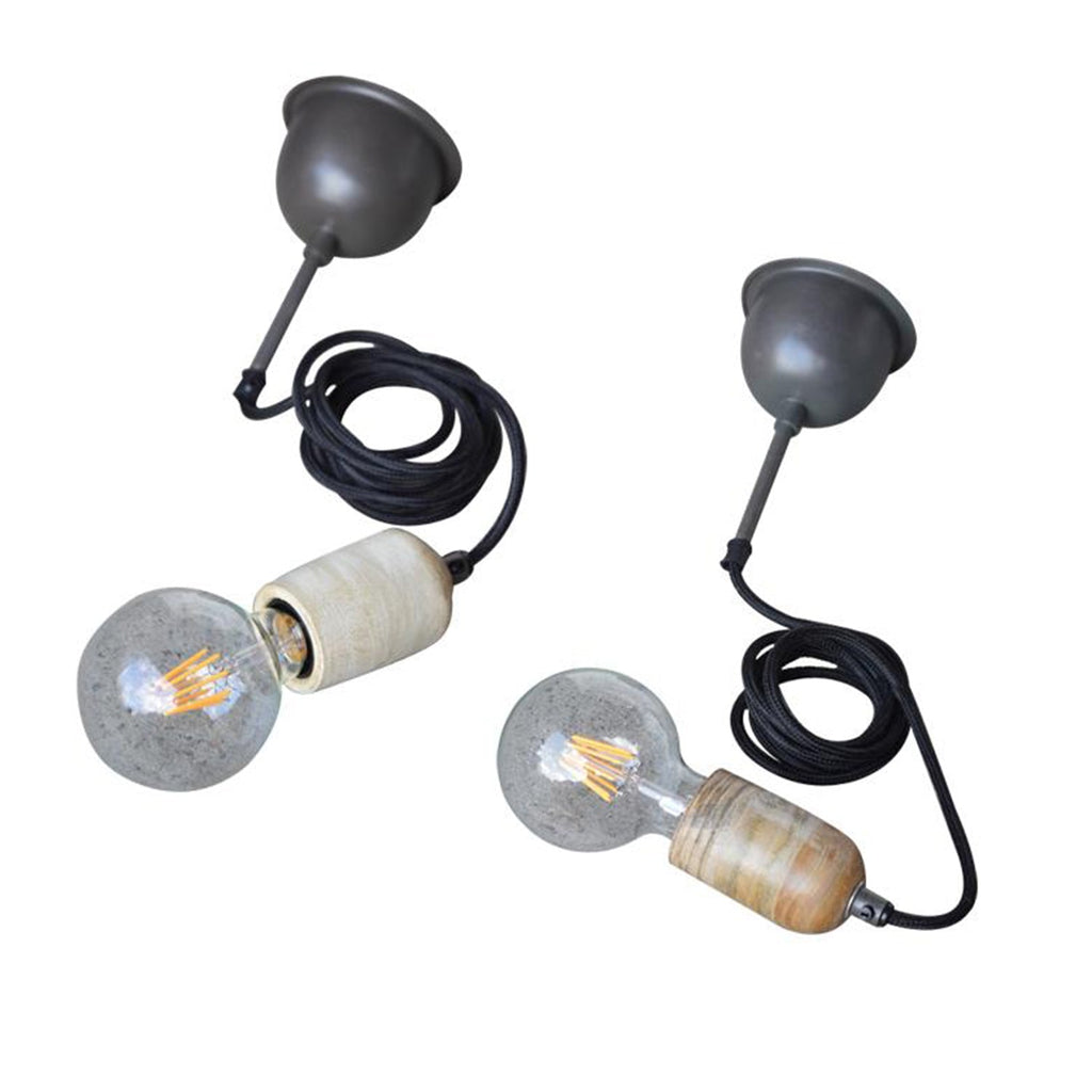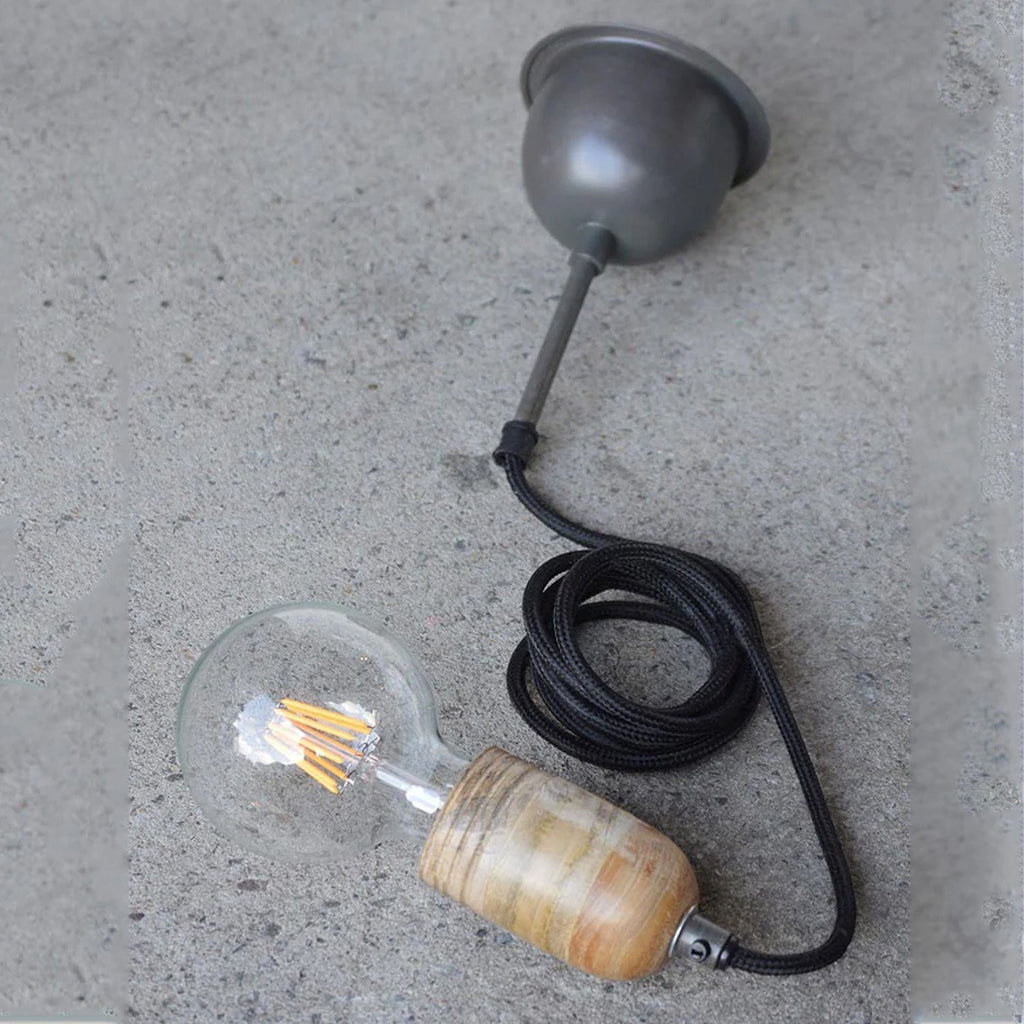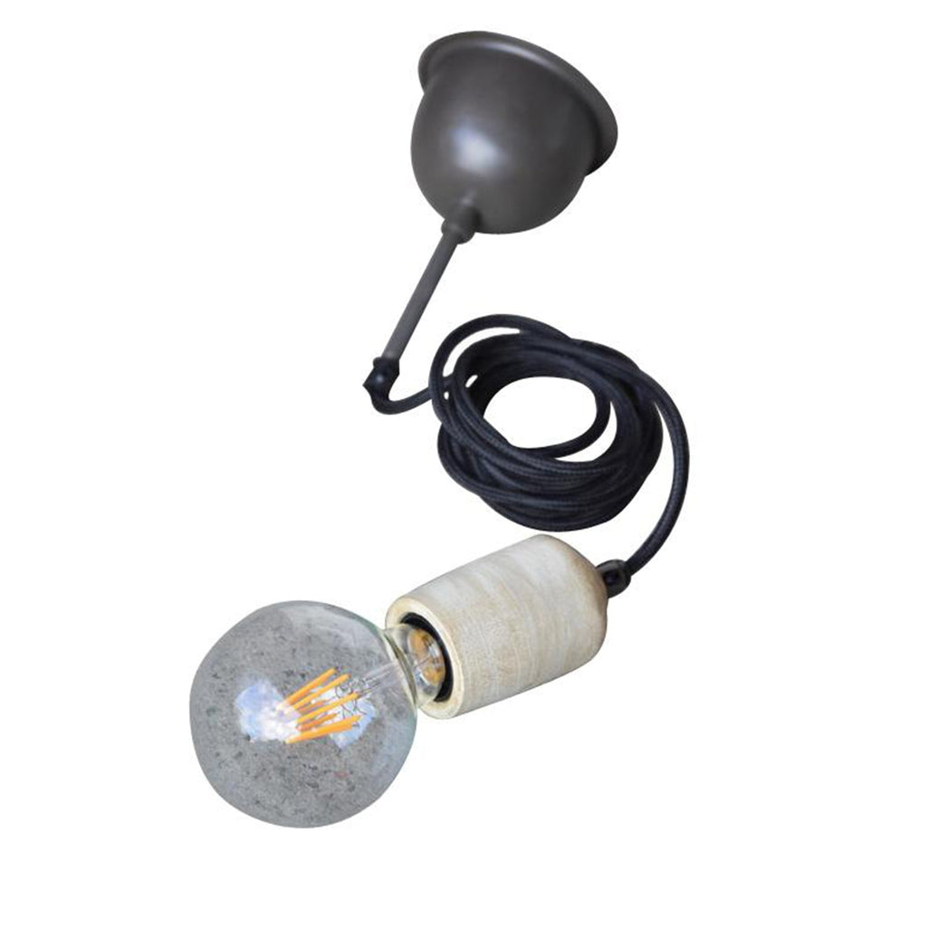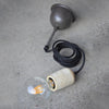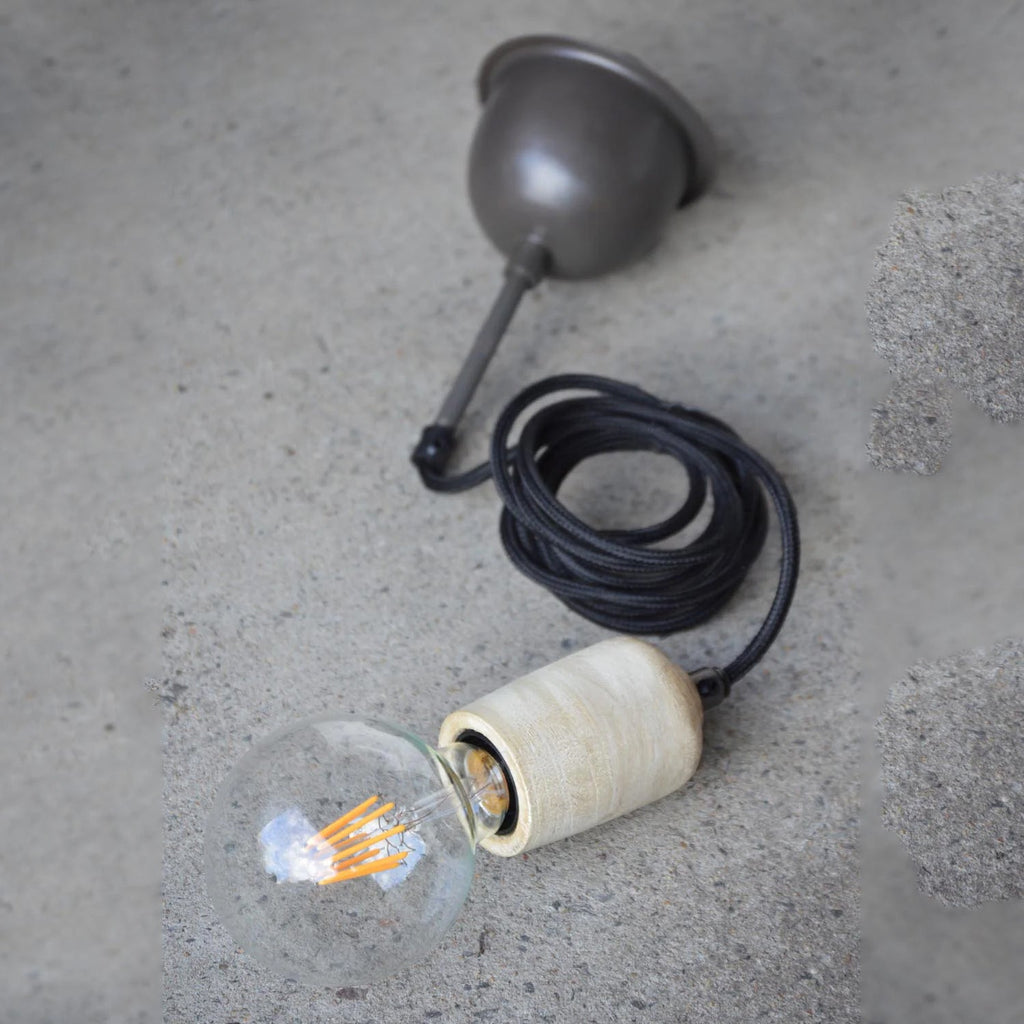 A beautiful pale wood cord drop suspended on a black textile electrical cord.