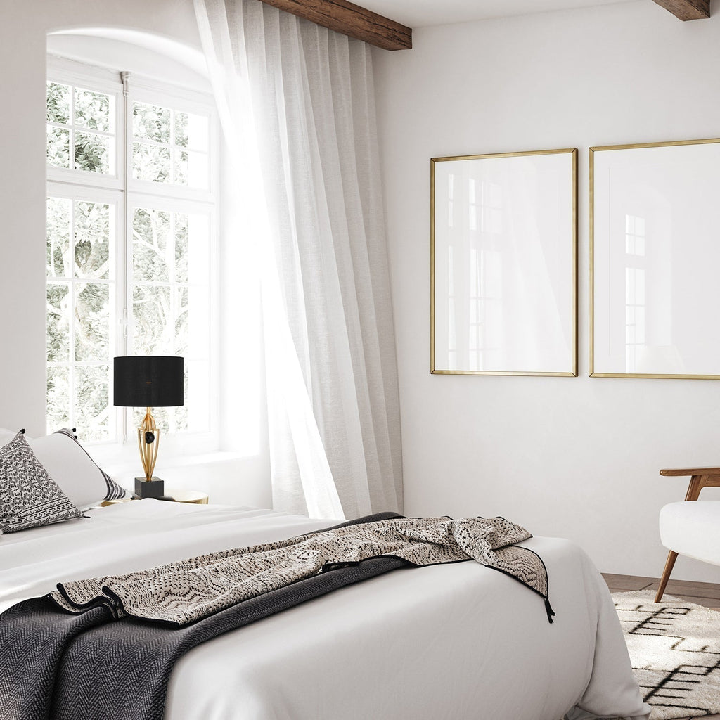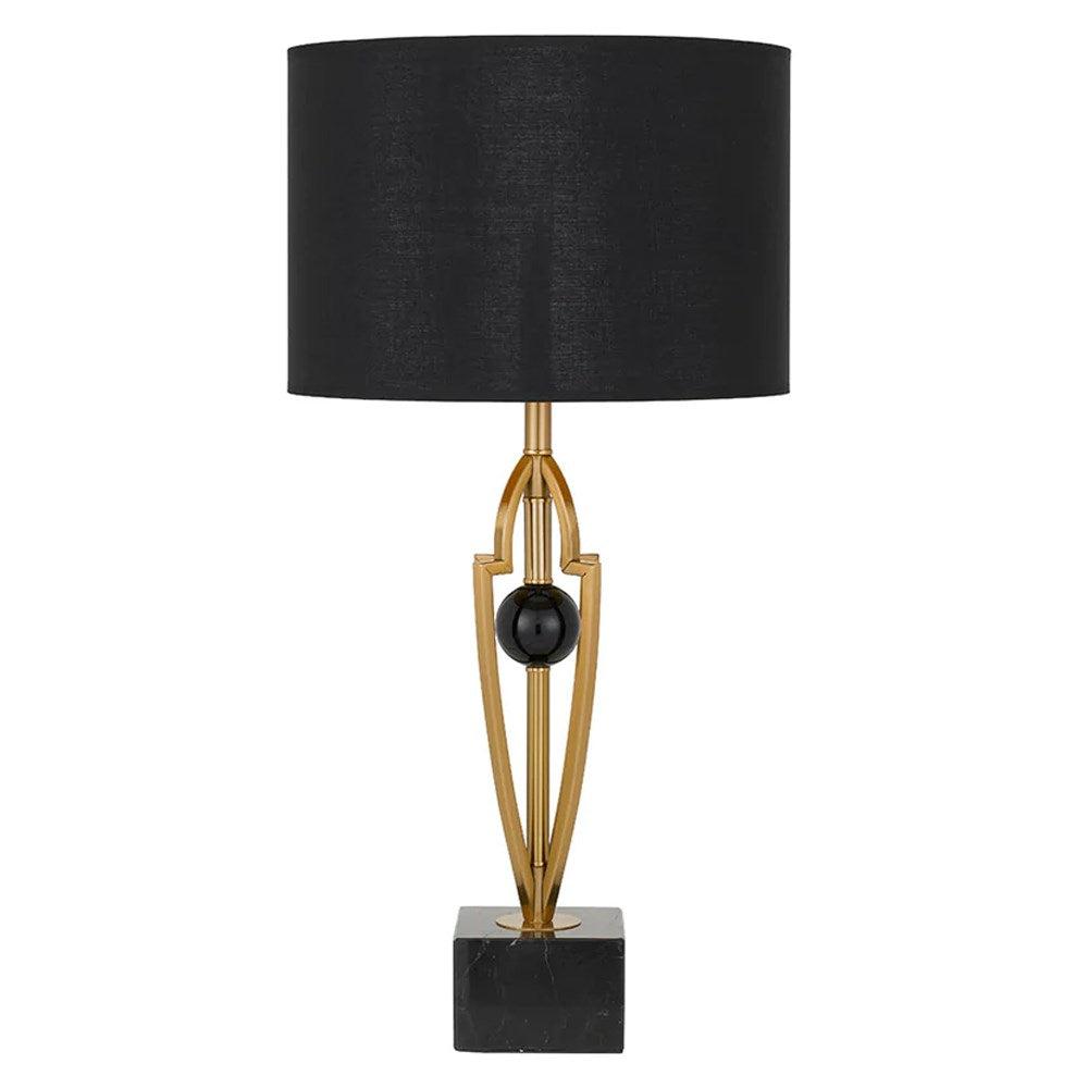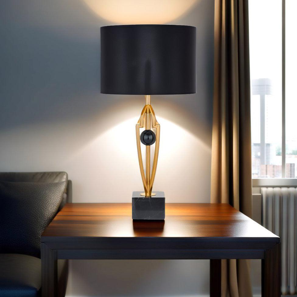The Vardo table lamp brings beauty to your modern living room space. Featuring a black shade, antique gold body, all resting on a black marble cube.