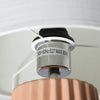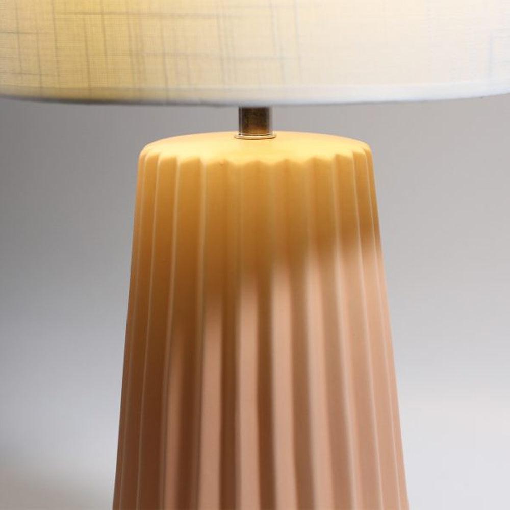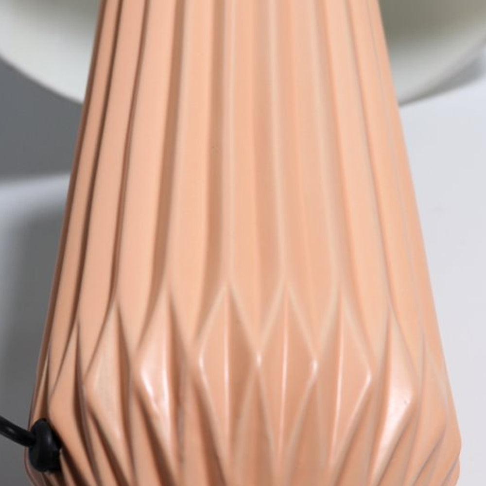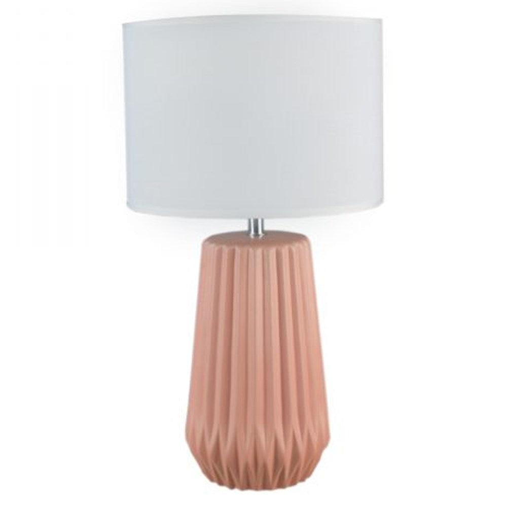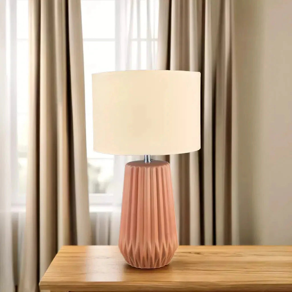 The Zora Ceramic Table Lamp screams mid-19th century decor with a stunning salmon pink ceramic body with a long vertical moulded ruffle design. The matte white cylindrical linen shade makes the base the star of this lamp with an open-top to spread light up and above, while the open bottom highlights the contours of the base.